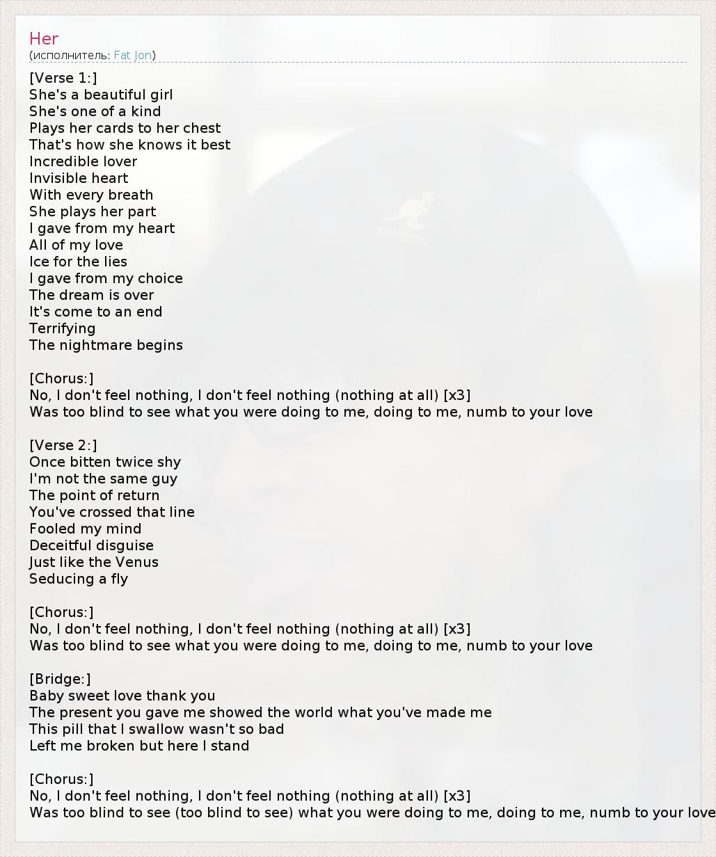 [Куплет 1;] Она красивая девушка. Она такая одна. Никому не раскрывает свои карты. Она отлично с этим справляется. Невероятная любовница, Закрывшая сердце. Каждым вздохом Она играет свою роль. От всей души я отдал (ей) Всю свою любовь. Я отплатил холодом за ложь, 1 И это был мой выбор. Этот сон закончился, Он подошёл к концу. Ужасно! Начинается кошмар. [Припев:] Нет, я ничего не чувствую, я ничего не чувствую (совсем ничего) [x3] Был так слеп, что не замечал, что ты делала со мной, просто оцепенел от твоей любви. [Куплет 2:] Обжёгшись молоком — дуешь на воду. Я уже не тот парень, каким был раньше. Точка невозврата Тобой уже пройдена. Дурачила меня, Лживая притворщица, Как плотоядный цветок, 2 Заманивающий мух. [Припев:] Нет, я ничего не чувствую, я ничего не чувствую (совсем ничего) [x3] Был так слеп, что не замечал, что ты делала со мной, просто оцепенел от твоей любви. [Переход:] Детка, милая, благодаря тебе, Подарок, который ты подарила мне, показал всему миру, во что ты меня превратила. Пилюля, которую я проглотил, не была сильно горькой. Ты сломала меня, но я выстоял. [Припев:] Нет, я ничего не чувствую, я ничего не чувствую (совсем ничего) [x3] Был так слеп, что не замечал, что ты делала со мной, просто оцепенел от твоей любви. 1 - строчка напоминает известное библейское выражение "eye for an eye" - "око за око". Парень охладел к девушке, когда понял, что она обманывает его. 2 - буквально "Венера, манящая мух". Фраза образована из английского названия плотоядного цветка росянки (Венерина мухоловка) (лат. Dionaea muscipula, англ. Venus flytrap), который приманивает мух особым запахом и внешним видом, а затем, быстро смыкая створки, ловит и переваривает их.