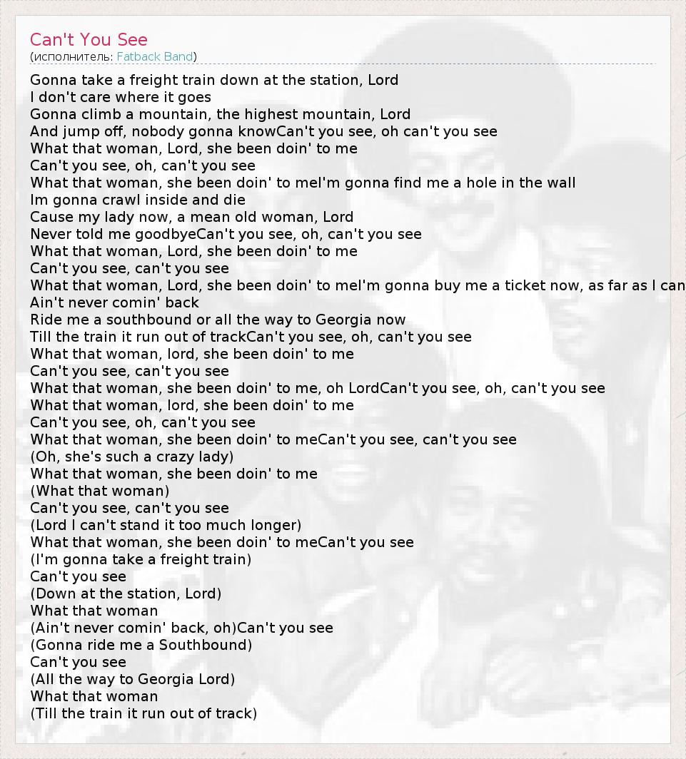 Gonna take a freight train down at the station, Lord I don't care where it goes Gonna climb a mountain, the highest mountain, Lord And jump off, nobody gonna knowCan't you see, oh can't you see What that woman, Lord, she been doin' to me Can't you see, oh, can't you see What that woman, she been doin' to meI'm gonna find me a hole in the wall Im gonna crawl inside and die Cause my lady now, a mean old woman, Lord Never told me goodbyeCan't you see, oh, can't you see What that woman, Lord, she been doin' to me Can't you see, can't you see What that woman, Lord, she been doin' to meI'm gonna buy me a ticket now, as far as I can Ain't never comin' back Ride me a southbound or all the way to Georgia now Till the train it run out of trackCan't you see, oh, can't you see What that woman, lord, she been doin' to me Can't you see, can't you see What that woman, she been doin' to me, oh LordCan't you see, oh, can't you see What that woman, lord, she been doin' to me Can't you see, oh, can't you see What that woman, she been doin' to meCan't you see, can't you see (Oh, she's such a crazy lady) What that woman, she been doin' to me (What that woman) Can't you see, can't you see (Lord I can't stand it too much longer) What that woman, she been doin' to meCan't you see (I'm gonna take a freight train) Can't you see (Down at the station, Lord) What that woman (Ain't never comin' back, oh)Can't you see (Gonna ride me a Southbound) Can't you see (All the way to Georgia Lord) What that woman (Till the train it run out of track)