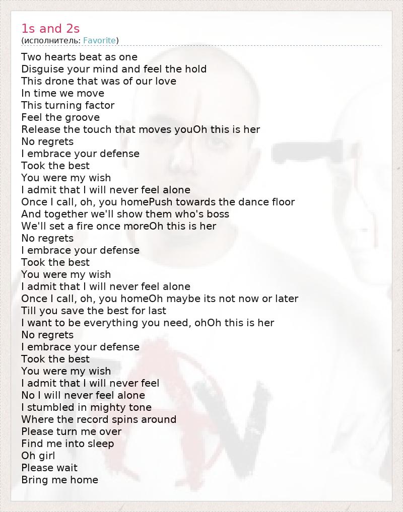Two hearts beat as one Disguise your mind and feel the hold This drone that was of our love In time we move This turning factor Feel the groove Release the touch that moves youOh this is her No regrets I embrace your defense Took the best You were my wish I admit that I will never feel alone Once I call, oh, you homePush towards the dance floor And together we'll show them who's boss We'll set a fire once moreOh this is her No regrets I embrace your defense Took the best You were my wish I admit that I will never feel alone Once I call, oh, you homeOh maybe its not now or later Till you save the best for last I want to be everything you need, ohOh this is her No regrets I embrace your defense Took the best You were my wish I admit that I will never feel No I will never feel alone I stumbled in mighty tone Where the record spins around Please turn me over Find me into sleep Oh girl Please wait Bring me home