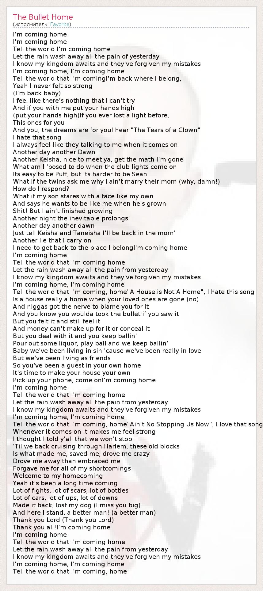I'm coming home I'm coming home Tell the world I'm coming home Let the rain wash away all the pain of yesterday I know my kingdom awaits and they've forgiven my mistakes I'm coming home, I'm coming home Tell the world that I'm comingI'm back where I belong, Yeah I never felt so strong (I'm back baby) I feel like there's nothing that I can't try And if you with me put your hands high (put your hands high)If you ever lost a light before, This ones for you And you, the dreams are for youI hear "The Tears of a Clown" I hate that song I always feel like they talking to me when it comes on Another day another Dawn Another Keisha, nice to meet ya, get the math I'm gone What am I 'posed to do when the club lights come on Its easy to be Puff, but its harder to be Sean What if the twins ask me why I ain't marry their mom (why, damn!) How do I respond? What if my son stares with a face like my own And says he wants to be like me when he's grown Shit! But I ain't finished growing Another night the inevitable prolongs Another day another dawn Just tell Keisha and Taneisha I'll be back in the morn' Another lie that I carry on I need to get back to the place I belongI'm coming home I'm coming home Tell the world that I'm coming home Let the rain wash away all the pain from yesterday I know my kingdom awaits and they've forgiven my mistakes I'm coming home, I'm coming home Tell the world that I'm coming, home"A House is Not A Home", I hate this song Is a house really a home when your loved ones are gone (no) And niggas got the nerve to blame you for it And you know you woulda took the bullet if you saw it But you felt it and still feel it And money can't make up for it or conceal it But you deal with it and you keep ballin' Pour out some liquor, play ball and we keep ballin' Baby we've been living in sin 'cause we've been really in love But we've been living as friends So you've been a guest in your own home It's time to make your house your own Pick up your phone, come onI'm coming home I'm coming home Tell the world that I'm coming home Let the rain wash away all the pain from yesterday I know my kingdom awaits and they've forgiven my mistakes I'm coming home, I'm coming home Tell the world that I'm coming, home"Ain't No Stopping Us Now", I love that song Whenever it comes on it makes me feel strong I thought I told y'all that we won't stop 'Til we back cruising through Harlem, these old blocks Is what made me, saved me, drove me crazy Drove me away than embraced me Forgave me for all of my shortcomings Welcome to my homecoming Yeah it's been a long time coming Lot of fights, lot of scars, lot of bottles Lot of cars, lot of ups, lot of downs Made it back, lost my dog (I miss you big) And here I stand, a better man! (a better man) Thank you Lord (Thank you Lord) Thank you all!I'm coming home I'm coming home Tell the world that I'm coming home Let the rain wash away all the pain from yesterday I know my kingdom awaits and they've forgiven my mistakes I'm coming home, I'm coming home Tell the world that I'm coming, home