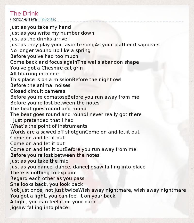 Just as you take my hand Just as you write my number down Just as the drinks arrive Just as they play your favorite songAs your blather disappears No longer wound up like a spring Before you've had too much Come back and focus againThe walls abandon shape You've got a Cheshire cat grin All blurring into one This place is on a missionBefore the night owl Before the animal noises Closed circuit cameras Before you're comatoseBefore you run away from me Before you're lost between the notes The beat goes round and round The beat goes round and roundI never really got there I just pretended that I had What's the point of instruments Words are a sawed off shotgunCome on and let it out Come on and let it out Come on and let it out Come on and let it outBefore you run away from me Before you're lost between the notes Just as you take the mic Just as you dance, dance, danceJigsaw falling into place There is nothing to explain Regard each other as you pass She looks back, you look back Not just once, not just twiceWish away nightmare, wish away nightmare You got a light, you can feel it on your back A light, you can feel it on your back Jigsaw falling into place