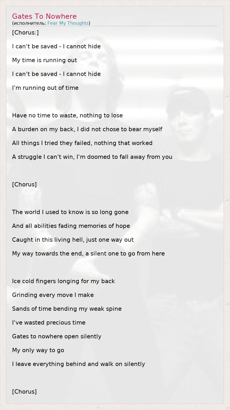[Chorus:] I can't be saved - I cannot hide My time is running out I can't be saved - I cannot hide I'm running out of time Have no time to waste, nothing to lose A burden on my back, I did not chose to bear myself All things I tried they failed, nothing that worked A struggle I can't win, I'm doomed to fall away from you [Chorus] The world I used to know is so long gone And all abilities fading memories of hope Caught in this living hell, just one way out My way towards the end, a silent one to go from here Ice cold fingers longing for my back Grinding every move I make Sands of time bending my weak spine I've wasted precious time Gates to nowhere open silently My only way to go I leave everything behind and walk on silently [Chorus]