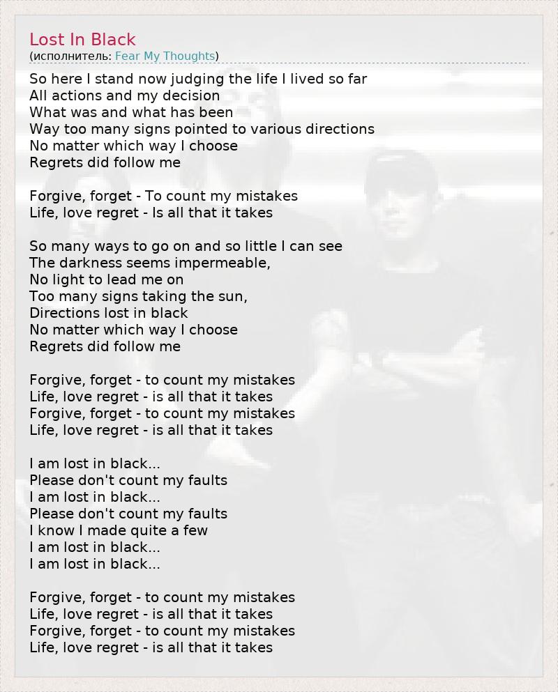 Теперь я здесь стою, рассуждая о жизни, которая давно прошла, О всех моих действиях и решении, Которое я когда то принял. Слишком много знаков указывали мне на разные направления, Не важно, который из них я избрал. Сожаления преследовали меня Прости и забудь - Как считать мои ошибки Сожаление о жизни и любви - Всё, что требуется Так много способов продолжить путь, и ни одного я не вижу. Поглощающая темнота кажется непроницаемой, Нет света, чтобы вести меня. Слишком много знаков горят на солнце, Все направления затерялись в темноте. Не важно какой путь я избрал. Сожаления преследовали меня Прости и забудь - Как считать мои ошибки Сожаление о жизни и любви - Всё, что требуется Прости и забудь - Как считать мои ошибки Сожаление о жизни и любви - Всё, что требуется Я потерян в темноте... Пожалуйста, не считай моих ошибок Я потерян в темноте... Пожалуйста, не считай моих ошибок Я знаю, я сделал их достаточно Я потерян в темноте Я потерян в темноте Прости и забудь - Как считать мои ошибки Сожаление о жизни и любви - Всё, что требуется Прости и забудь - Как считать мои ошибки Сожаление о жизни и любви - Всё, что требуется
