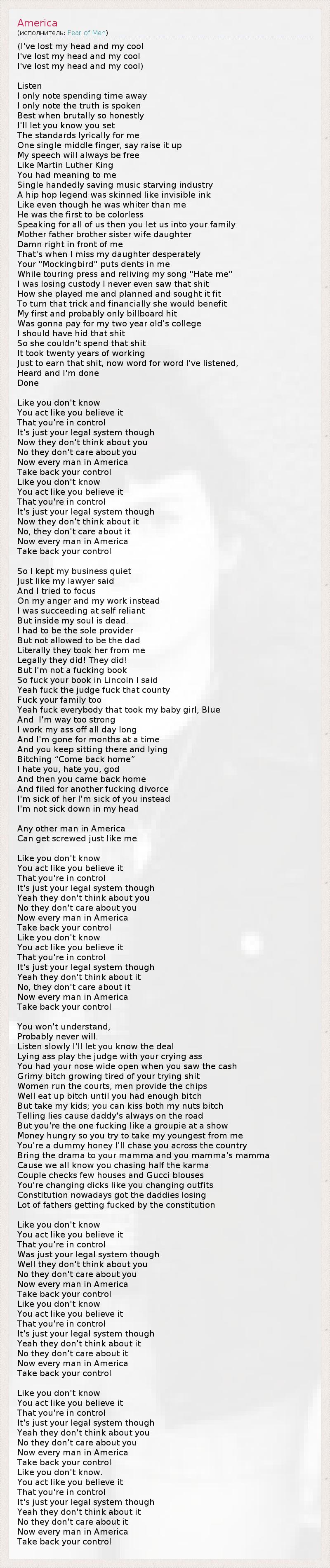 (I've lost my head and my cool I've lost my head and my cool I've lost my head and my cool) Listen I only note spending time away I only note the truth is spoken Best when brutally so honestly I'll let you know you set The standards lyrically for me One single middle finger, say raise it up My speech will always be free Like Martin Luther King You had meaning to me Single handedly saving music starving industry A hip hop legend was skinned like invisible ink Like even though he was whiter than me He was the first to be colorless Speaking for all of us then you let us into your family Mother father brother sister wife daughter Damn right in front of me That's when I miss my daughter desperately Your "Mockingbird" puts dents in me While touring press and reliving my song "Hate me" I was losing custody I never even saw that shit How she played me and planned and sought it fit To turn that trick and financially she would benefit My first and probably only billboard hit Was gonna pay for my two year old's college I should have hid that shit So she couldn't spend that shit It took twenty years of working Just to earn that shit, now word for word I've listened, Heard and I'm done Done Like you don't know You act like you believe it That you're in control It's just your legal system though Now they don't think about you No they don't care about you Now every man in America Take back your control Like you don't know You act like you believe it That you're in control It's just your legal system though Now they don't think about it No, they don't care about it Now every man in America Take back your control So I kept my business quiet Just like my lawyer said And I tried to focus On my anger and my work instead I was succeeding at self reliant But inside my soul is dead. I had to be the sole provider But not allowed to be the dad Literally they took her from me Legally they did! They did! But I'm not a fucking book So fuck your book in Lincoln I said Yeah fuck the judge fuck that county Fuck your family too Yeah fuck everybody that took my baby girl, Blue And I'm way too strong I work my ass off all day long And I'm gone for months at a time And you keep sitting there and lying Bitching “Come back home” I hate you, hate you, god And then you came back home And filed for another fucking divorce I'm sick of her I'm sick of you instead I'm not sick down in my head Any other man in America Can get screwed just like me Like you don't know You act like you believe it That you're in control It's just your legal system though Yeah they don't think about you No they don't care about you Now every man in America Take back your control Like you don't know You act like you believe it That you're in control It's just your legal system though Yeah they don't think about it No, they don't care about it Now every man in America Take back your control You won't understand, Probably never will. Listen slowly I'll let you know the deal Lying ass play the judge with your crying ass You had your nose wide open when you saw the cash Grimy bitch growing tired of your trying shit Women run the courts, men provide the chips Well eat up bitch until you had enough bitch But take my kids; you can kiss both my nuts bitch Telling lies cause daddy's always on the road But you're the one fucking like a groupie at a show Money hungry so you try to take my youngest from me You're a dummy honey I'll chase you across the country Bring the drama to your mamma and you mamma's mamma Cause we all know you chasing half the karma Couple checks few houses and Gucci blouses You're changing dicks like you changing outfits Constitution nowadays got the daddies losing Lot of fathers getting fucked by the constitution Like you don't know You act like you believe it That you're in control Was just your legal system though Well they don't think about you No they don't care about you Now every man in America Take back your control Like you don't know You act like you believe it That you're in control It's just your legal system though Yeah they don't think about it No they don't care about it Now every man in America Take back your control Like you don't know You act like you believe it That you're in control It's just your legal system though Yeah they don't think about you No they don't care about you Now every man in America Take back your control Like you don't know. You act like you believe it That you're in control It's just your legal system though Yeah they don't think about it No they don't care about it Now every man in America Take back your control