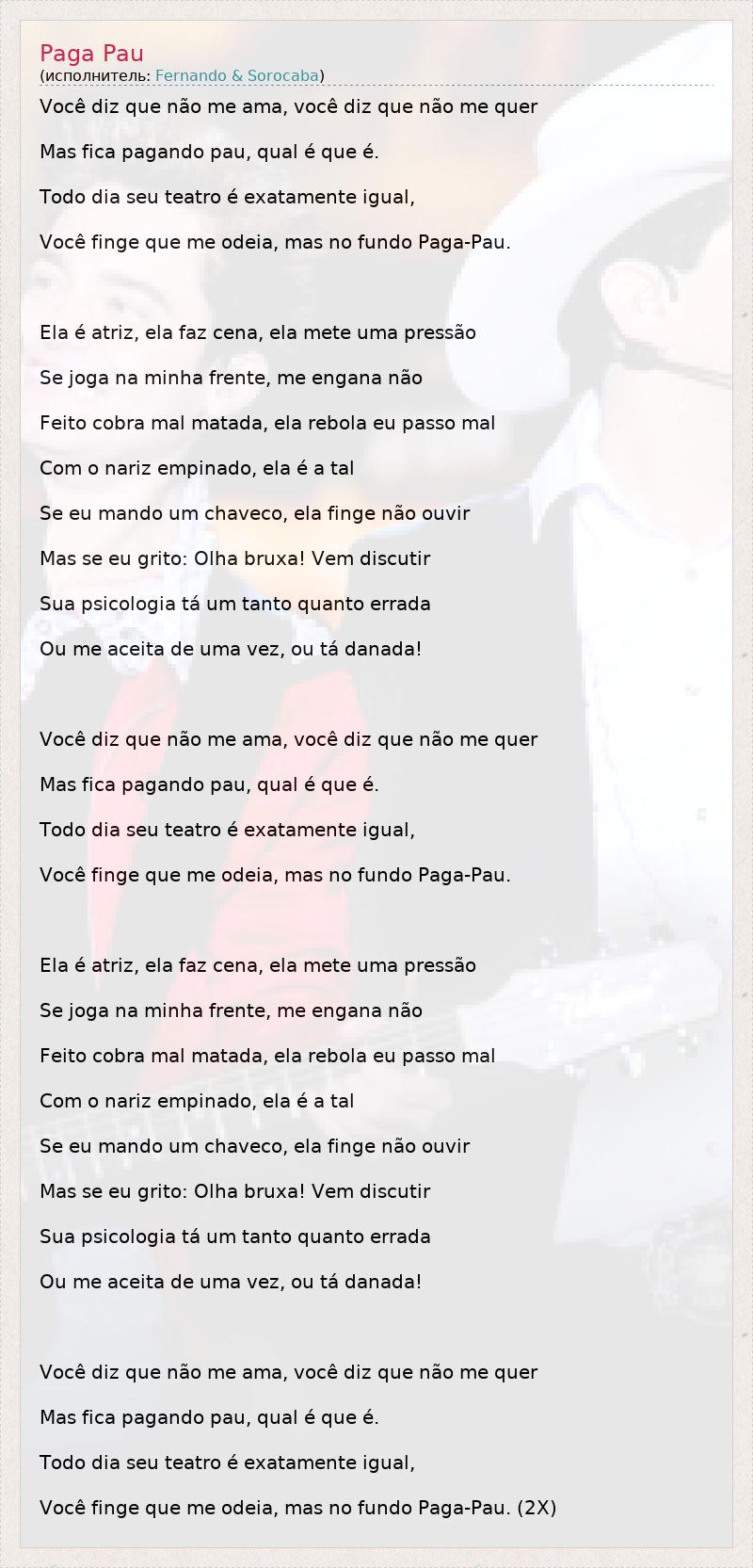 Você diz que não me ama, você diz que não me quer Mas fica pagando pau, qual é que é. Todo dia seu teatro é exatamente igual, Você finge que me odeia, mas no fundo Paga-Pau. Ela é atriz, ela faz cena, ela mete uma pressão Se joga na minha frente, me engana não Feito cobra mal matada, ela rebola eu passo mal Com o nariz empinado, ela é a tal Se eu mando um chaveco, ela finge não ouvir Mas se eu grito: Olha bruxa! Vem discutir Sua psicologia tá um tanto quanto errada Ou me aceita de uma vez, ou tá danada! Você diz que não me ama, você diz que não me quer Mas fica pagando pau, qual é que é. Todo dia seu teatro é exatamente igual, Você finge que me odeia, mas no fundo Paga-Pau. Ela é atriz, ela faz cena, ela mete uma pressão Se joga na minha frente, me engana não Feito cobra mal matada, ela rebola eu passo mal Com o nariz empinado, ela é a tal Se eu mando um chaveco, ela finge não ouvir Mas se eu grito: Olha bruxa! Vem discutir Sua psicologia tá um tanto quanto errada Ou me aceita de uma vez, ou tá danada! Você diz que não me ama, você diz que não me quer Mas fica pagando pau, qual é que é. Todo dia seu teatro é exatamente igual, Você finge que me odeia, mas no fundo Paga-Pau. (2X)