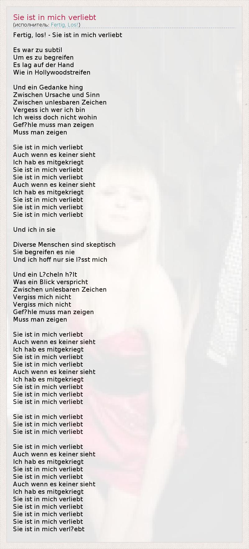 Fertig, los! - Sie ist in mich verliebt Es war zu subtil Um es zu begreifen Es lag auf der Hand Wie in Hollywoodstreifen Und ein Gedanke hing Zwischen Ursache und Sinn Zwischen unlesbaren Zeichen Vergess ich wer ich bin Ich weiss doch nicht wohin Gef?hle muss man zeigen Muss man zeigen Sie ist in mich verliebt Auch wenn es keiner sieht Ich hab es mitgekriegt Sie ist in mich verliebt Sie ist in mich verliebt Auch wenn es keiner sieht Ich hab es mitgekriegt Sie ist in mich verliebt Sie ist in mich verliebt Sie ist in mich verliebt Und ich in sie Diverse Menschen sind skeptisch Sie begreifen es nie Und ich hoff nur sie l?sst mich Und ein L?cheln h?lt Was ein Blick verspricht Zwischen unlesbaren Zeichen Vergiss mich nicht Vergiss mich nicht Gef?hle muss man zeigen Muss man zeigen Sie ist in mich verliebt Auch wenn es keiner sieht Ich hab es mitgekriegt Sie ist in mich verliebt Sie ist in mich verliebt Auch wenn es keiner sieht Ich hab es mitgekriegt Sie ist in mich verliebt Sie ist in mich verliebt Sie ist in mich verliebt Sie ist in mich verliebt Sie ist in mich verliebt Sie ist in mich verliebt Sie ist in mich verliebt Auch wenn es keiner sieht Ich hab es mitgekriegt Sie ist in mich verliebt Sie ist in mich verliebt Auch wenn es keiner sieht Ich hab es mitgekriegt Sie ist in mich verliebt Sie ist in mich verliebt Sie ist in mich verliebt Sie ist in mich verliebt Sie ist in mich verl?ebt