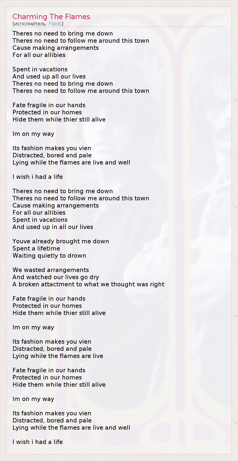 Theres no need to bring me down Theres no need to follow me around this town Cause making arrangements For all our allibies Spent in vacations And used up all our lives Theres no need to bring me down Theres no need to follow me around this town Fate fragile in our hands Protected in our homes Hide them while thier still alive Im on my way Its fashion makes you vien Distracted, bored and pale Lying while the flames are live and well I wish i had a life Theres no need to bring me down Theres no need to follow me around this town Cause making arrangements For all our allibies Spent in vacations And used up in all our lives Youve already brought me down Spent a lifetime Waiting quietly to drown We wasted arrangements And watched our lives go dry A broken attactment to what we thought was right Fate fragile in our hands Protected in our homes Hide them while thier still alive Im on my way Its fashion makes you vien Distracted, bored and pale Lying while the flames are live Fate fragile in our hands Protected in our homes Hide them while thier still alive Im on my way Its fashion makes you vien Distracted, bored and pale Lying while the flames are live and well I wish i had a life