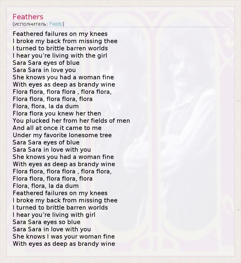 Feathered failures on my knees I broke my back from missing thee I turned to brittle barren worlds I hear you’re living with the girl Sara Sara eyes of blue Sara Sara in love you She knows you had a woman fine With eyes as deep as brandy wine Flora flora, flora flora , flora flora, Flora flora, flora flora, flora Flora, flora, la da dum Flora flora you knew her then You plucked her from her fields of men And all at once it came to me Under my favorite lonesome tree Sara Sara eyes of blue Sara Sara in love with you She knows you had a woman fine With eyes as deep as brandy wine Flora flora, flora flora , flora flora, Flora flora, flora flora, flora Flora, flora, la da dum Feathered failures on my knees I broke my back from missing thee I turned to brittle barren worlds I hear you’re living with girl Sara Sara eyes so blue Sara Sara in love with you She knows I was your woman fine With eyes as deep as brandy wine