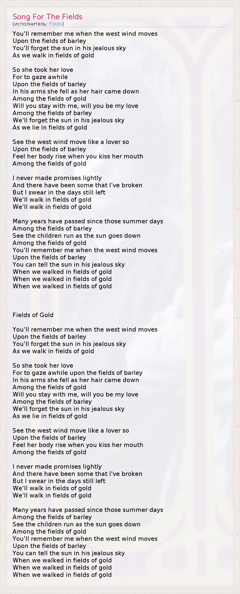 Ты будешь вспоминать меня, когда западный ветер Будет носиться по ячменным полям. Ты забудешь о солнце, с завистью смотрящем на нас с неба, Когда мы будем гулять среди золотых полей. Итак, она отвела своего любимого, Чтобы взглянуть вместе с ним На ячменные поля. Она упала в его объятия, и её волосы распустились Среди золотых полей. Ты останешься со мной? Ты будешь моей любовью Среди ячменных полей? Мы забудем о солнце, с завистью смотрящем на нас с неба, Когда будем лежать среди золотых полей. Посмотри, как нежно веет западный ветер Над ячменными полями. Почувствуй, как приподнимается её тело, когда ты целуешь её в губы Среди золотых полей. Я никогда не давал пустых обещаний. И хотя некоторые из них я не сдержал, Клянусь, что пока мы будем вместе, Мы будем гулять среди золотых полей. Мы будем гулять среди золотых полей. Прошло немало времени с той летней поры Среди ячменных полей. Посмотри, как бегают дети в лучах заходящего солнца Среди золотых полей. Ты будешь вспоминать меня, когда западный ветер Будет носиться по ячменным полям. Расскажи солнцу, с завистью смотрящему на нас с неба, Как мы гуляли среди золотых полей, Как мы гуляли среди золотых полей, Как мы гуляли среди золотых полей... Золотые поля* (перевод Иван Гром из Тулы) Вспоминай меня с западным ветром, Что колышет в поле ячмень, Солнце спустится вниз метр за метром, Забирая у нас этот день. Мы пойдем, держась за руки нежно, Посмотреть на поля ячменя; Мы уснем, и заснут безмятежно Вокруг нас золотые поля. Ты останешься? Сможешь меня полюбить, Как тебя полюбил я когда-то? Мы забудем про солнце и будем лежать Средь полей из ячменного злата. Полюбуйся, как западный ветер Нежно гладит в поле ячмень; Обо всем позабудем на свете, С поцелуем уйдет этот день. Не давал я пустых обещаний; Хоть есть те, что не выполнил я, Поклянусь я тебе на прощанье- Мы найдем золотые поля (Мы найдем золотые поля). Много времени западный ветер Затерял средь ячменных полей. И теперь резво бегают дети От закатного солнца лучей. Вспоминай меня с западным ветром, Что колышет поля ячменя; Пусть завидует солнце, а мы метр за метром Углубимся в златые поля (Углубимся в златые поля, Углубимся в златые поля). * поэтический перевод