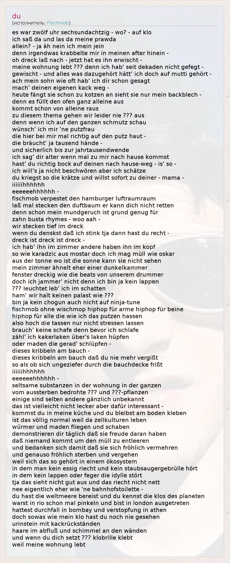 es war zwölf uhr sechsundachtzig - wo? - auf klo ich saß da und las da meine prawda allein? - ja äh nein ich mein jein denn irgendwas krabbelte mir in meinen after hinein - oh dreck laß nach - jetzt hat es ihn erwischt - meine wohnung lebt ??? denn ich hab' seit dekaden nicht gefegt - gewischt - und alles was dazugehört hätt' ich doch auf mutti gehört - ach mein sohn wie oft hab' ich dir schon gesagt mach' deinen eigenen kack weg - heute fängt sie schon zu kotzen an sieht sie nur mein backblech - denn es füllt den ofen ganz alleine aus kommt schon von alleine raus zu diesem thema gehen wir leider nie ??? aus denn wenn ich auf den ganzen schmutz schau wünsch' ich mir 'ne putzfrau die hier bei mir mal richtig auf den putz haut - die bräucht' ja tausend hände - und sicherlich bis zur jahrtausendwende ich sag' dir alter wenn mal zu mir nach hause kommst hast' du richtig bock auf deinen nach hause-weg - is' so - ich will's ja nicht beschwören aber ich schätze du kriegst so die krätze und willst sofort zu deiner - mama - iiiiiihhhhhh eeeeeehhhhhh - fischmob verpestet den hamburger luftraumraum laß mal stecken den duftbaum er kann dich nicht retten denn schon mein mundgeruch ist grund genug für zahn busta rhymes - woo aah - wir stecken tief im dreck wenn du denskst daß ich stink tja dann hast du recht - dreck ist dreck ist dreck - ich hab' ihn im zimmer andere haben ihn im kopf so wie karadzic aus mostar doch ich mag müll wie oskar aus der tonne wo ist die sonne kann sie nicht sehen mein zimmer ähnelt eher einer dunkelkammer fenster dreckig wie die beats von unserem drummer doch ich jammer' nicht denn ich bin ja kein lappen ??? leuchtet leb' ich im schatten ham' wir halt keinen palast wie ??? bin ja kein chogun auch nicht auf ninja-tune fischmob ohne wischmop hiphop für arme hiphop für beine hiphop für alle die wie ich das putzen hassen also hoch die tassen nur nicht stressen lassen brauch' keine schafe denn bevor ich schlafe zähl' ich kakerlaken über's laken hüpfen oder maden die gerad' schlüpfen - dieses kribbeln am bauch - dieses kribbeln am bauch daß du nie mehr vergißt so als ob sich ungeziefer durch die bauchdecke frißt iiiiiihhhhhh eeeeeehhhhhh - seltsame substanzen in der wohnung in der ganzen vom aussterben bedrohte ??? und ???-pflanzen einige sind selten andere gänzlich unbekannt das ist vielleicht nicht lecker aber dafür interessant - kommst du in meine küche und du bleibst am boden kleben ist das völlig normal weil da zellkulturen leben würmer und maden fliegen und schaben demonstrieren dir täglich daß sie freude daran haben daß niemand kommt um den müll zu entleeren und bedanken sich damit daß sie sich fröhlich vermehren und genauso fröhlich sterben und vergehen weil sich das so gehört in einem ökosystem in dem man kein essig riecht und kein staubsaugergebrülle hört in dem kein lappen oder feger die idylle stört tja das sieht nicht gut aus und das riecht nicht nett nee eigentlich eher wie 'ne bahnhofstoilette - du hast die weltmeere bereist und du kennst die klos des planeten warst in rio schon mal pinkeln und bist in london ausgetreten hattest durchfall in bombay und verstopfung in athen doch sowas wie mein klo hast du noch nie gesehen urinstein mit kackrückständen haare im abfluß und schimmel an den wänden und wenn du dich setzt ??? klobrille klebt weil meine wohnung lebt