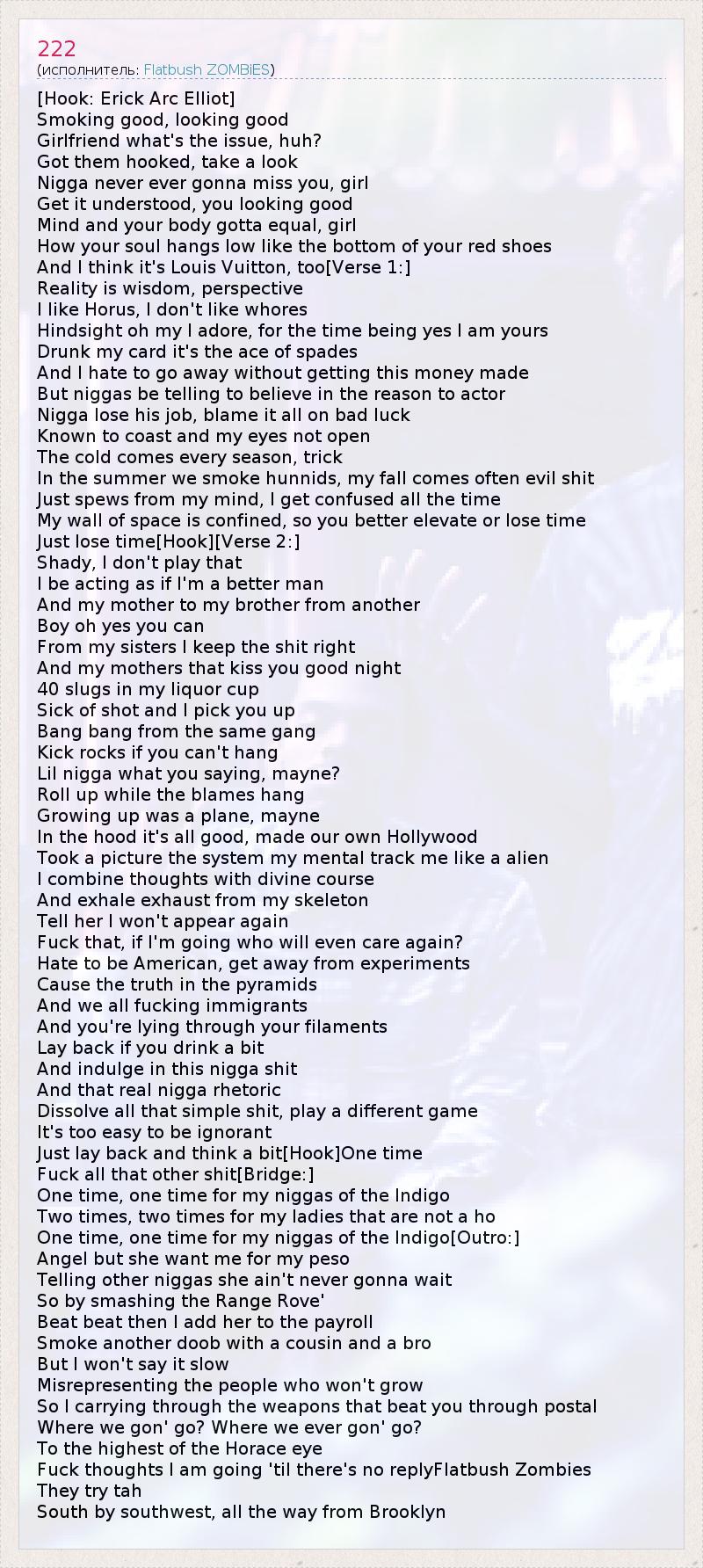 [Hook: Erick Arc Elliot] Smoking good, looking good Girlfriend what's the issue, huh? Got them hooked, take a look Nigga never ever gonna miss you, girl Get it understood, you looking good Mind and your body gotta equal, girl How your soul hangs low like the bottom of your red shoes And I think it's Louis Vuitton, too[Verse 1:] Reality is wisdom, perspective I like Horus, I don't like whores Hindsight oh my I adore, for the time being yes I am yours Drunk my card it's the ace of spades And I hate to go away without getting this money made But niggas be telling to believe in the reason to actor Nigga lose his job, blame it all on bad luck Known to coast and my eyes not open The cold comes every season, trick In the summer we smoke hunnids, my fall comes often evil shit Just spews from my mind, I get confused all the time My wall of space is confined, so you better elevate or lose time Just lose time[Hook][Verse 2:] Shady, I don't play that I be acting as if I'm a better man And my mother to my brother from another Boy oh yes you can From my sisters I keep the shit right And my mothers that kiss you good night 40 slugs in my liquor cup Sick of shot and I pick you up Bang bang from the same gang Kick rocks if you can't hang Lil nigga what you saying, mayne? Roll up while the blames hang Growing up was a plane, mayne In the hood it's all good, made our own Hollywood Took a picture the system my mental track me like a alien I combine thoughts with divine course And exhale exhaust from my skeleton Tell her I won't appear again Fuck that, if I'm going who will even care again? Hate to be American, get away from experiments Cause the truth in the pyramids And we all fucking immigrants And you're lying through your filaments Lay back if you drink a bit And indulge in this nigga shit And that real nigga rhetoric Dissolve all that simple shit, play a different game It's too easy to be ignorant Just lay back and think a bit[Hook]One time Fuck all that other shit[Bridge:] One time, one time for my niggas of the Indigo Two times, two times for my ladies that are not a ho One time, one time for my niggas of the Indigo[Outro:] Angel but she want me for my peso Telling other niggas she ain't never gonna wait So by smashing the Range Rove' Beat beat then I add her to the payroll Smoke another doob with a cousin and a bro But I won't say it slow Misrepresenting the people who won't grow So I carrying through the weapons that beat you through postal Where we gon' go? Where we ever gon' go? To the highest of the Horace eye Fuck thoughts I am going 'til there's no replyFlatbush Zombies They try tah South by southwest, all the way from Brooklyn