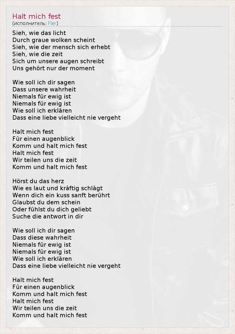 Sieh, wie das licht Durch graue wolken scheint Sieh, wie der mensch sich erhebt Sieh, wie die zeit Sich um unsere augen schreibt Uns gehört nur der moment Wie soll ich dir sagen Dass unsere wahrheit Niemals für ewig ist Niemals für ewig ist Wie soll ich erklären Dass eine liebe vielleicht nie vergeht Halt mich fest Für einen augenblick Komm und halt mich fest Halt mich fest Wir teilen uns die zeit Komm und halt mich fest Hörst du das herz Wie es laut und kräftig schlägt Wenn dich ein kuss sanft berührt Glaubst du dem schein Oder fühlst du dich geliebt Suche die antwort in dir Wie soll ich dir sagen Dass diese wahrheit Niemals für ewig ist Niemals für ewig ist Wie soll ich erklären Dass eine liebe vielleicht nie vergeht Halt mich fest Für einen augenblick Komm und halt mich fest Halt mich fest Wir teilen uns die zeit Komm und halt mich fest