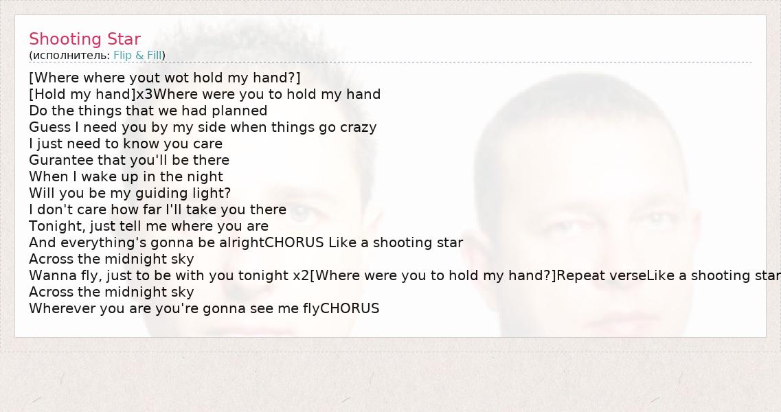 [Where where yout wot hold my hand?] [Hold my hand]x3Where were you to hold my hand Do the things that we had planned Guess I need you by my side when things go crazy I just need to know you care Gurantee that you'll be there When I wake up in the night Will you be my guiding light? I don't care how far I'll take you there Tonight, just tell me where you are And everything's gonna be alrightCHORUS Like a shooting star Across the midnight sky Wanna fly, just to be with you tonight x2[Where were you to hold my hand?]Repeat verseLike a shooting star Across the midnight sky Wherever you are you're gonna see me flyCHORUS