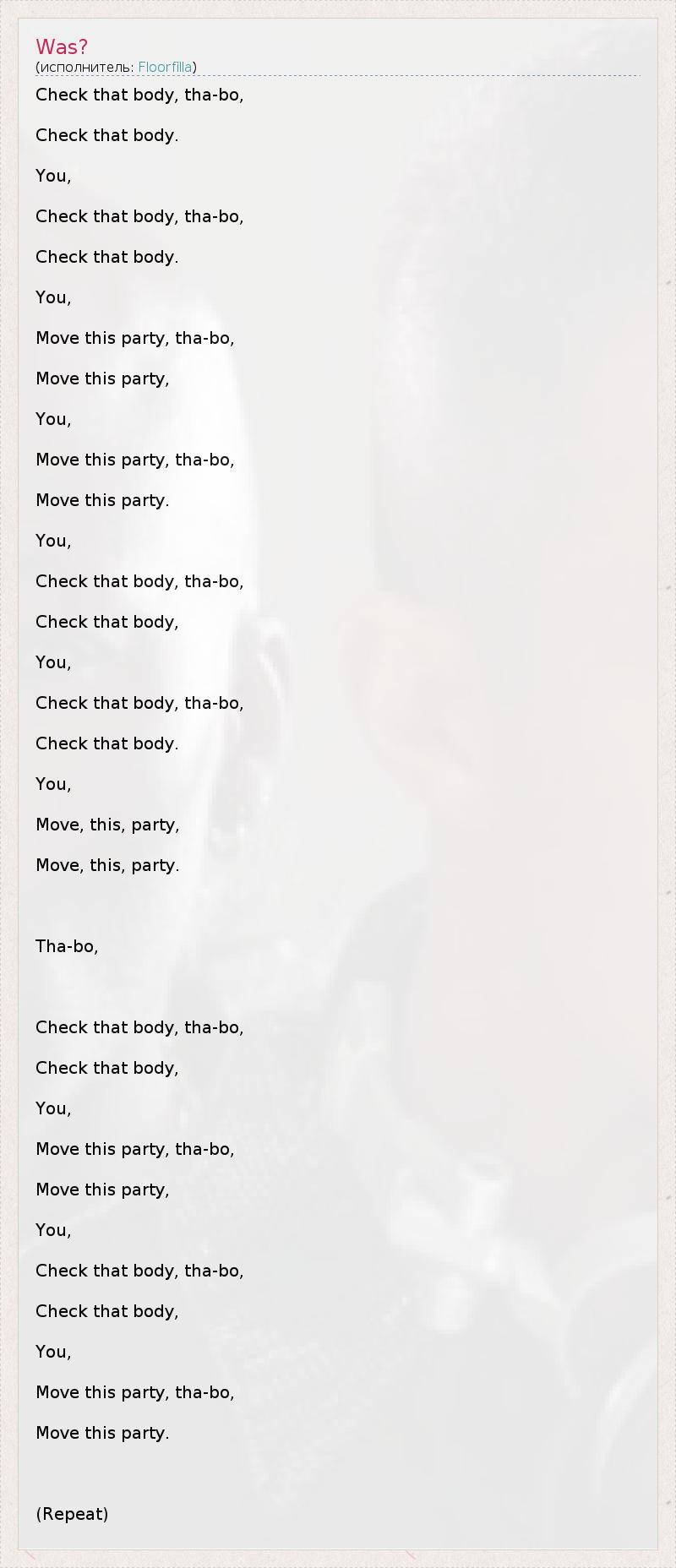 Check that body, tha-bo, Check that body. You, Check that body, tha-bo, Check that body. You, Move this party, tha-bo, Move this party, You, Move this party, tha-bo, Move this party. You, Check that body, tha-bo, Check that body, You, Check that body, tha-bo, Check that body. You, Move, this, party, Move, this, party. Tha-bo, Check that body, tha-bo, Check that body, You, Move this party, tha-bo, Move this party, You, Check that body, tha-bo, Check that body, You, Move this party, tha-bo, Move this party. (Repeat)