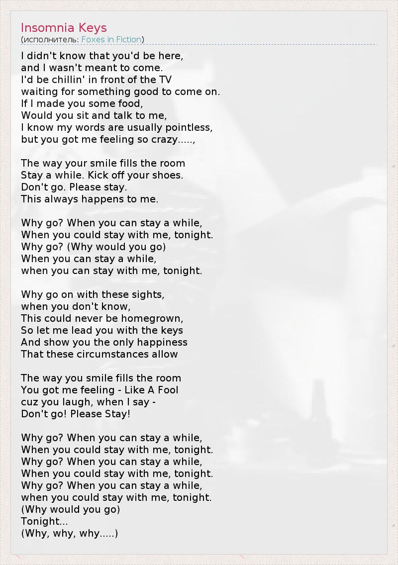 I didn't know that you'd be here, and I wasn't meant to come. I'd be chillin' in front of the TV waiting for something good to come on. If I made you some food, Would you sit and talk to me, I know my words are usually pointless, but you got me feeling so crazy....., The way your smile fills the room Stay a while. Kick off your shoes. Don't go. Please stay. This always happens to me. Why go? When you can stay a while, When you could stay with me, tonight. Why go? (Why would you go) When you can stay a while, when you can stay with me, tonight. Why go on with these sights, when you don't know, This could never be homegrown, So let me lead you with the keys And show you the only happiness That these circumstances allow The way you smile fills the room You got me feeling - Like A Fool cuz you laugh, when I say - Don't go! Please Stay! Why go? When you can stay a while, When you could stay with me, tonight. Why go? When you can stay a while, When you could stay with me, tonight. Why go? When you can stay a while, when you could stay with me, tonight. (Why would you go) Tonight... (Why, why, why.....)