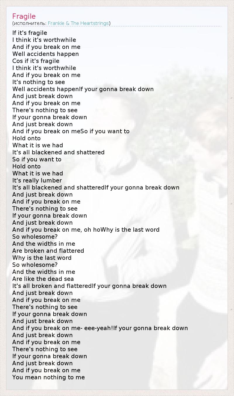 If it's fragile I think it's worthwhile And if you break on me Well accidents happen Cos if it's fragile I think it's worthwhile And if you break on me It's nothing to see Well accidents happenIf your gonna break down And just break down And if you break on me There's nothing to see If your gonna break down And just break down And if you break on meSo if you want to Hold onto What it is we had It's all blackened and shattered So if you want to Hold onto What it is we had It's really lumber It's all blackened and shatteredIf your gonna break down And just break down And if you break on me There's nothing to see If your gonna break down And just break down And if you break on me, oh hoWhy is the last word So wholesome? And the widths in me Are broken and flattered Why is the last word So wholesome? And the widths in me Are like the dead sea It's all broken and flatteredIf your gonna break down And just break down And if you break on me There's nothing to see If your gonna break down And just break down And if you break on me- eee-yeah!If your gonna break down And just break down And if you break on me There's nothing to see If your gonna break down And just break down And if you break on me You mean nothing to me