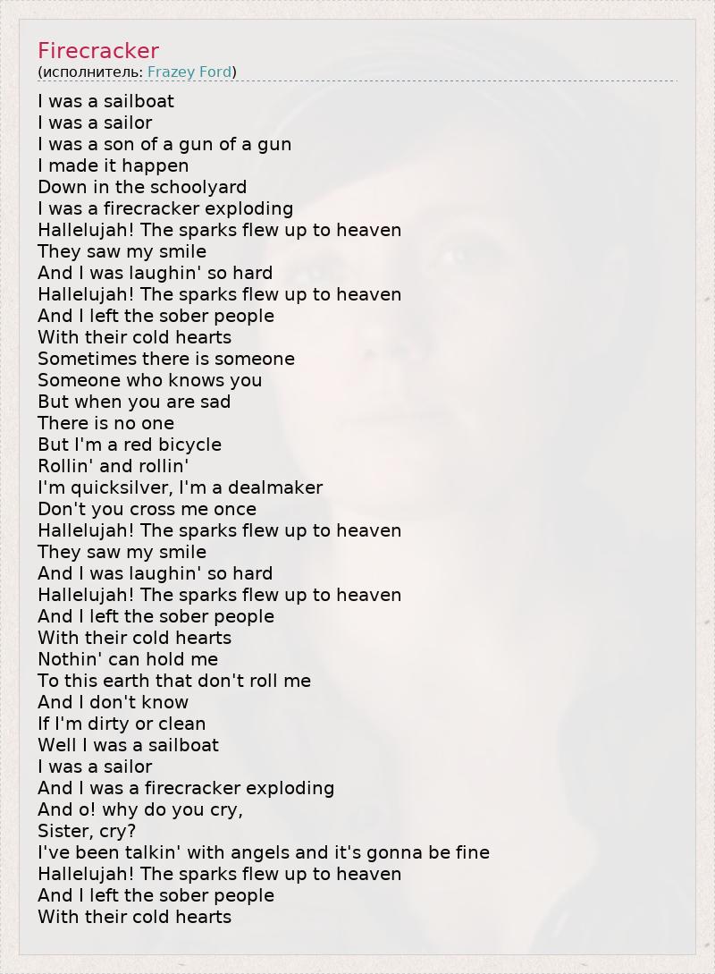 I was a sailboat I was a sailor I was a son of a gun of a gun I made it happen Down in the schoolyard I was a firecracker exploding Hallelujah! The sparks flew up to heaven They saw my smile And I was laughin' so hard Hallelujah! The sparks flew up to heaven And I left the sober people With their cold hearts Sometimes there is someone Someone who knows you But when you are sad There is no one But I'm a red bicycle Rollin' and rollin' I'm quicksilver, I'm a dealmaker Don't you cross me once Hallelujah! The sparks flew up to heaven They saw my smile And I was laughin' so hard Hallelujah! The sparks flew up to heaven And I left the sober people With their cold hearts Nothin' can hold me To this earth that don't roll me And I don't know If I'm dirty or clean Well I was a sailboat I was a sailor And I was a firecracker exploding And o! why do you cry, Sister, cry? I've been talkin' with angels and it's gonna be fine Hallelujah! The sparks flew up to heaven And I left the sober people With their cold hearts