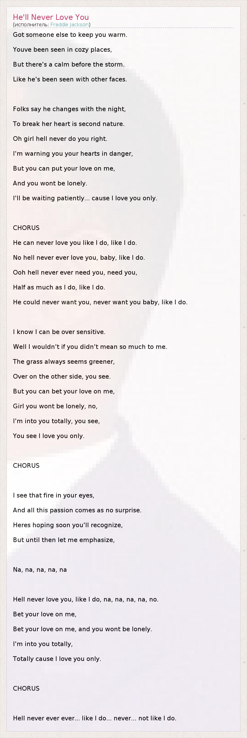 Got someone else to keep you warm. Youve been seen in cozy places, But there's a calm before the storm. Like he's been seen with other faces. Folks say he changes with the night, To break her heart is second nature. Oh girl hell never do you right. I'm warning you your hearts in danger, But you can put your love on me, And you wont be lonely. I'll be waiting patiently... cause I love you only. CHORUS He can never love you like I do, like I do. No hell never ever love you, baby, like I do. Ooh hell never ever need you, need you, Half as much as I do, like I do. He could never want you, never want you baby, like I do. I know I can be over sensitive. Well I wouldn't if you didn't mean so much to me. The grass always seems greener, Over on the other side, you see. But you can bet your love on me, Girl you wont be lonely, no, I'm into you totally, you see, You see I love you only. CHORUS I see that fire in your eyes, And all this passion comes as no surprise. Heres hoping soon you'll recognize, But until then let me emphasize, Na, na, na, na, na Hell never love you, like I do, na, na, na, na, no. Bet your love on me, Bet your love on me, and you wont be lonely. I'm into you totally, Totally cause I love you only. CHORUS Hell never ever ever... like I do... never... not like I do.