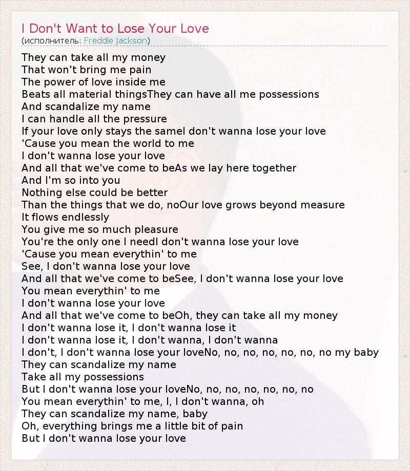 They can take all my money That won't bring me pain The power of love inside me Beats all material thingsThey can have all me possessions And scandalize my name I can handle all the pressure If your love only stays the sameI don't wanna lose your love 'Cause you mean the world to me I don't wanna lose your love And all that we've come to beAs we lay here together And I'm so into you Nothing else could be better Than the things that we do, noOur love grows beyond measure It flows endlessly You give me so much pleasure You're the only one I needI don't wanna lose your love 'Cause you mean everythin' to me See, I don't wanna lose your love And all that we've come to beSee, I don't wanna lose your love You mean everythin' to me I don't wanna lose your love And all that we've come to beOh, they can take all my money I don't wanna lose it, I don't wanna lose it I don't wanna lose it, I don't wanna, I don't wanna I don't, I don't wanna lose your loveNo, no, no, no, no, no, no my baby They can scandalize my name Take all my possessions But I don't wanna lose your loveNo, no, no, no, no, no, no You mean everythin' to me, I, I don't wanna, oh They can scandalize my name, baby Oh, everything brings me a little bit of pain But I don't wanna lose your love