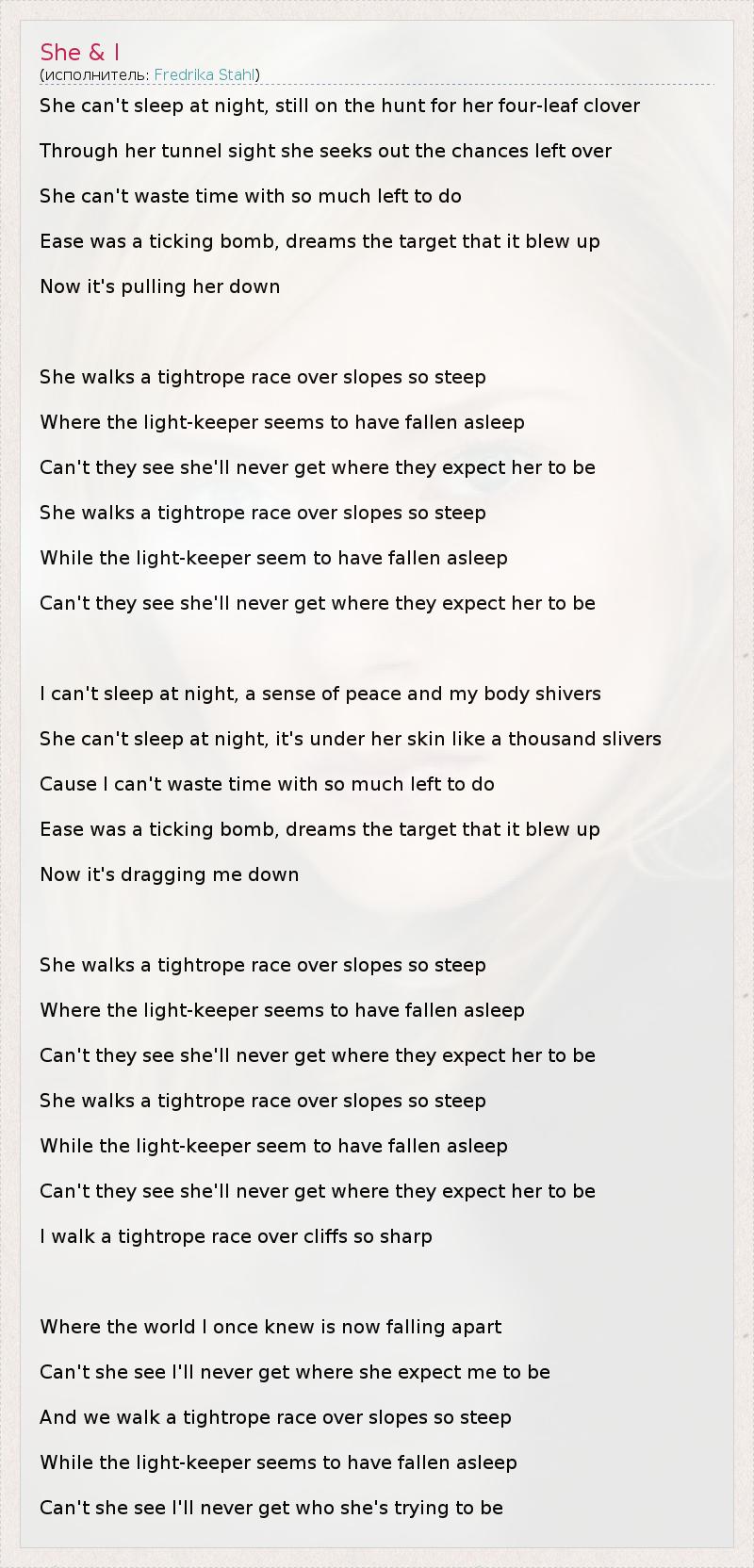 She can't sleep at night, still on the hunt for her four-leaf clover Through her tunnel sight she seeks out the chances left over She can't waste time with so much left to do Ease was a ticking bomb, dreams the target that it blew up Now it's pulling her down She walks a tightrope race over slopes so steep Where the light-keeper seems to have fallen asleep Can't they see she'll never get where they expect her to be She walks a tightrope race over slopes so steep While the light-keeper seem to have fallen asleep Can't they see she'll never get where they expect her to be I can't sleep at night, a sense of peace and my body shivers She can't sleep at night, it's under her skin like a thousand slivers Cause I can't waste time with so much left to do Ease was a ticking bomb, dreams the target that it blew up Now it's dragging me down She walks a tightrope race over slopes so steep Where the light-keeper seems to have fallen asleep Can't they see she'll never get where they expect her to be She walks a tightrope race over slopes so steep While the light-keeper seem to have fallen asleep Can't they see she'll never get where they expect her to be I walk a tightrope race over cliffs so sharp Where the world I once knew is now falling apart Can't she see I'll never get where she expect me to be And we walk a tightrope race over slopes so steep While the light-keeper seems to have fallen asleep Can't she see I'll never get who she's trying to be