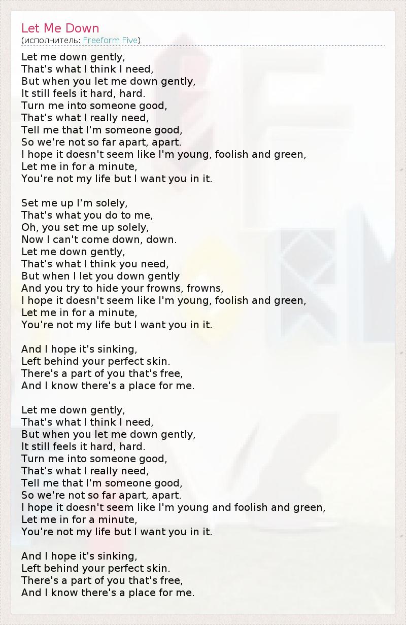 Let me down gently, That's what I think I need, But when you let me down gently, It still feels it hard, hard. Turn me into someone good, That's what I really need, Tell me that I'm someone good, So we're not so far apart, apart. I hope it doesn't seem like I'm young, foolish and green, Let me in for a minute, You're not my life but I want you in it. Set me up I'm solely, That's what you do to me, Oh, you set me up solely, Now I can't come down, down. Let me down gently, That's what I think you need, But when I let you down gently And you try to hide your frowns, frowns, I hope it doesn't seem like I'm young, foolish and green, Let me in for a minute, You're not my life but I want you in it. And I hope it's sinking, Left behind your perfect skin. There's a part of you that's free, And I know there's a place for me. Let me down gently, That's what I think I need, But when you let me down gently, It still feels it hard, hard. Turn me into someone good, That's what I really need, Tell me that I'm someone good, So we're not so far apart, apart. I hope it doesn't seem like I'm young and foolish and green, Let me in for a minute, You're not my life but I want you in it. And I hope it's sinking, Left behind your perfect skin. There's a part of you that's free, And I know there's a place for me.