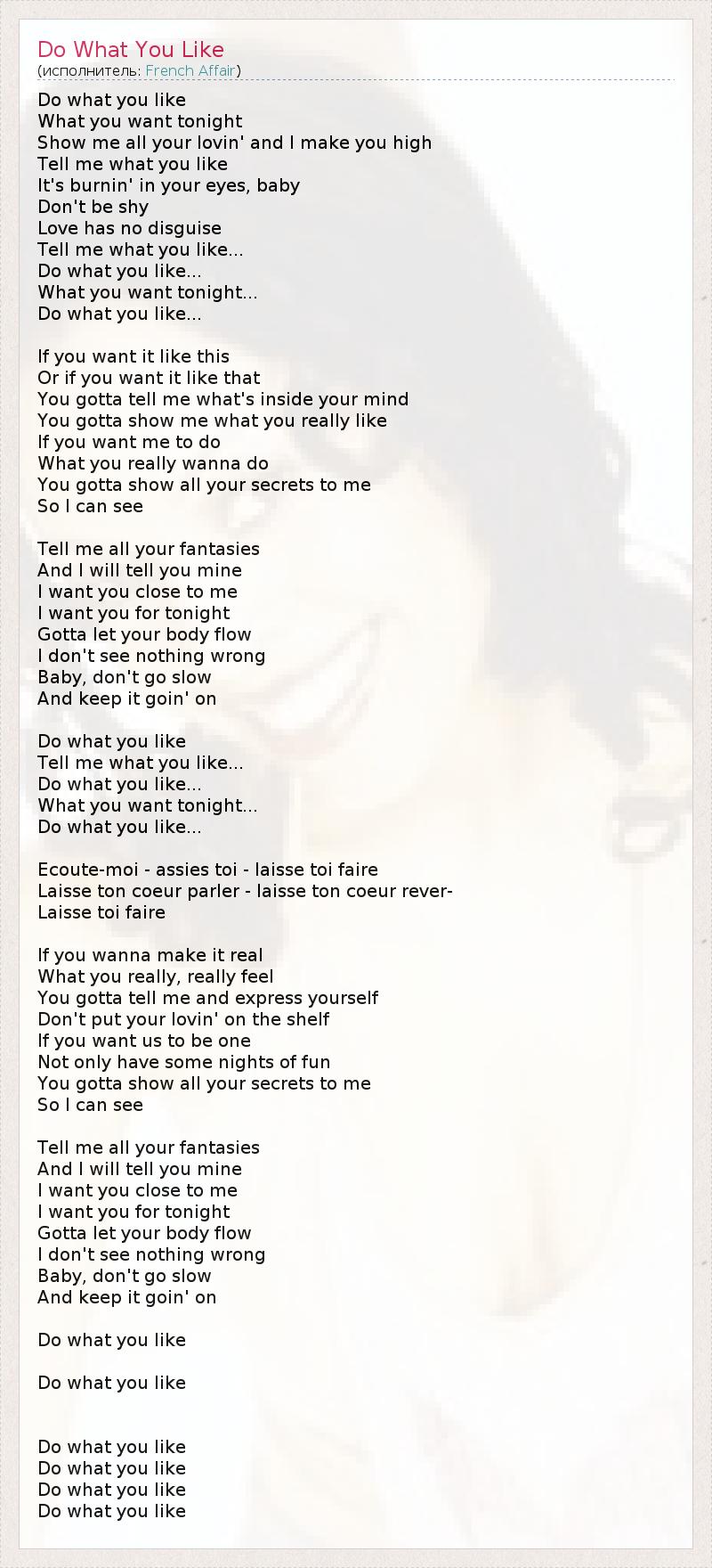 Do what you like What you want tonight Show me all your lovin' and I make you high Tell me what you like It's burnin' in your eyes, baby Don't be shy Love has no disguise Tell me what you like... Do what you like... What you want tonight... Do what you like... If you want it like this Or if you want it like that You gotta tell me what's inside your mind You gotta show me what you really like If you want me to do What you really wanna do You gotta show all your secrets to me So I can see Tell me all your fantasies And I will tell you mine I want you close to me I want you for tonight Gotta let your body flow I don't see nothing wrong Baby, don't go slow And keep it goin' on Do what you like Tell me what you like... Do what you like... What you want tonight... Do what you like... Ecoute-moi - assies toi - laisse toi faire Laisse ton coeur parler - laisse ton coeur rever- Laisse toi faire If you wanna make it real What you really, really feel You gotta tell me and express yourself Don't put your lovin' on the shelf If you want us to be one Not only have some nights of fun You gotta show all your secrets to me So I can see Tell me all your fantasies And I will tell you mine I want you close to me I want you for tonight Gotta let your body flow I don't see nothing wrong Baby, don't go slow And keep it goin' on Do what you like Do what you like Do what you like Do what you like Do what you like Do what you like
