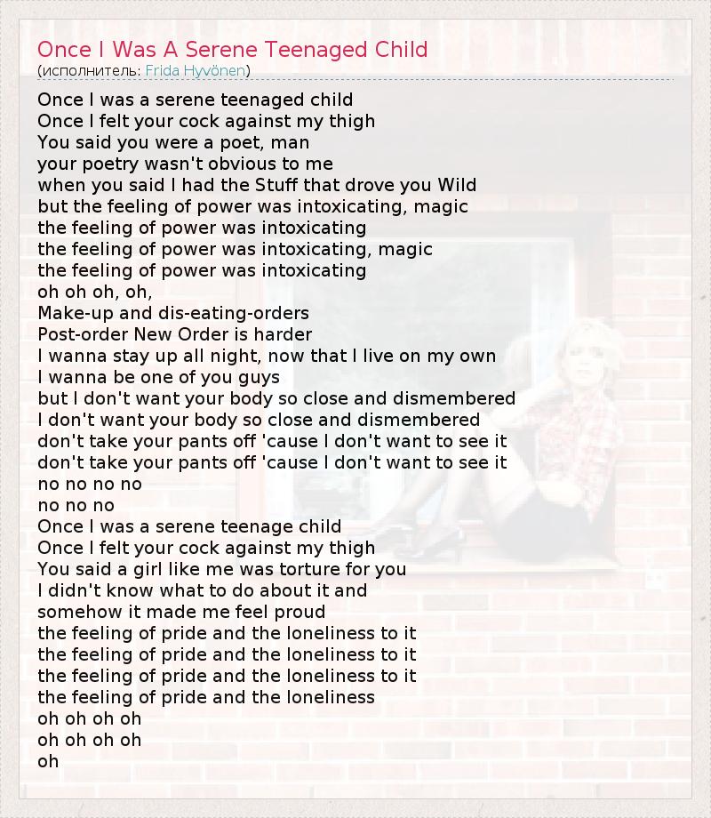 Once I was a serene teenaged child Once I felt your cock against my thigh You said you were a poet, man your poetry wasn't obvious to me when you said I had the Stuff that drove you Wild but the feeling of power was intoxicating, magic the feeling of power was intoxicating the feeling of power was intoxicating, magic the feeling of power was intoxicating oh oh oh, oh, Make-up and dis-eating-orders Post-order New Order is harder I wanna stay up all night, now that I live on my own I wanna be one of you guys but I don't want your body so close and dismembered I don't want your body so close and dismembered don't take your pants off 'cause I don't want to see it don't take your pants off 'cause I don't want to see it no no no no no no no Once I was a serene teenage child Once I felt your cock against my thigh You said a girl like me was torture for you I didn't know what to do about it and somehow it made me feel proud the feeling of pride and the loneliness to it the feeling of pride and the loneliness to it the feeling of pride and the loneliness to it the feeling of pride and the loneliness oh oh oh oh oh oh oh oh oh
