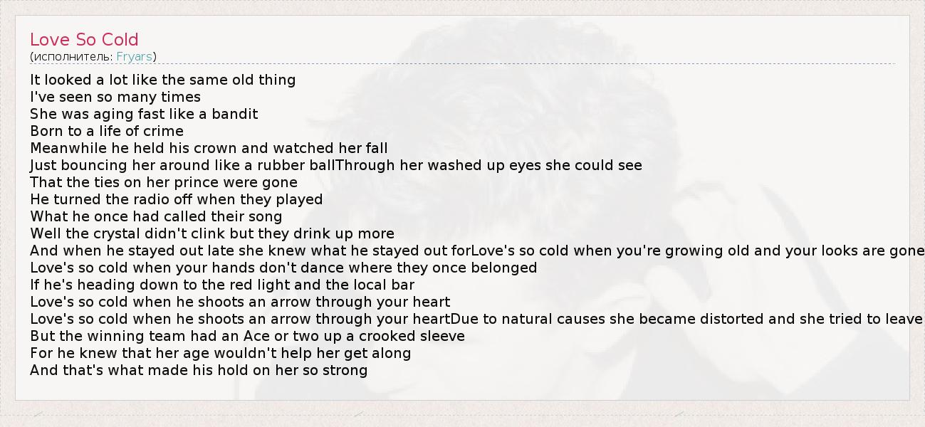 It looked a lot like the same old thing I've seen so many times She was aging fast like a bandit Born to a life of crime Meanwhile he held his crown and watched her fall Just bouncing her around like a rubber ballThrough her washed up eyes she could see That the ties on her prince were gone He turned the radio off when they played What he once had called their song Well the crystal didn't clink but they drink up more And when he stayed out late she knew what he stayed out forLove's so cold when you're growing old and your looks are gone Love's so cold when your hands don't dance where they once belonged If he's heading down to the red light and the local bar Love's so cold when he shoots an arrow through your heart Love's so cold when he shoots an arrow through your heartDue to natural causes she became distorted and she tried to leave But the winning team had an Ace or two up a crooked sleeve For he knew that her age wouldn't help her get along And that's what made his hold on her so strong