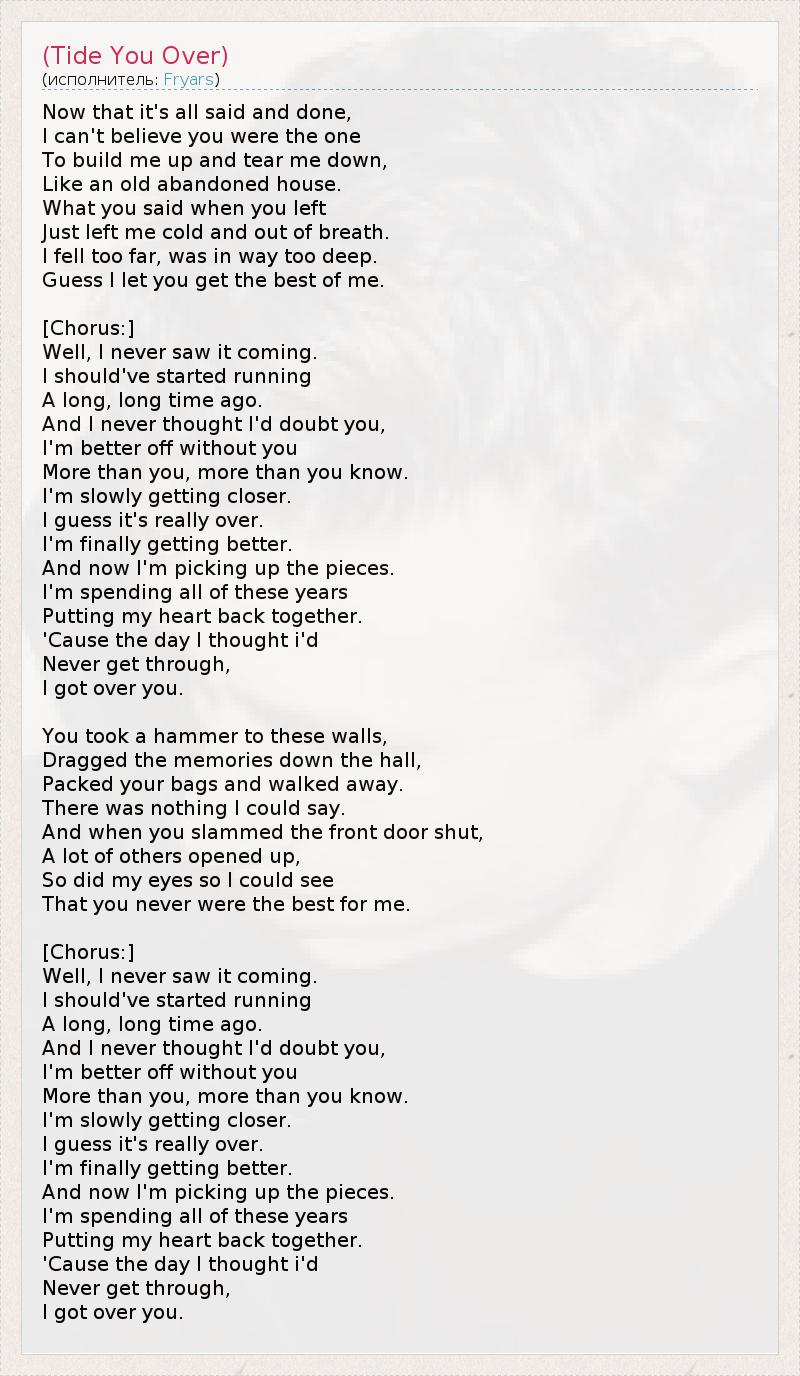 Now that it's all said and done, I can't believe you were the one To build me up and tear me down, Like an old abandoned house. What you said when you left Just left me cold and out of breath. I fell too far, was in way too deep. Guess I let you get the best of me. [Chorus:] Well, I never saw it coming. I should've started running A long, long time ago. And I never thought I'd doubt you, I'm better off without you More than you, more than you know. I'm slowly getting closer. I guess it's really over. I'm finally getting better. And now I'm picking up the pieces. I'm spending all of these years Putting my heart back together. 'Cause the day I thought i'd Never get through, I got over you. You took a hammer to these walls, Dragged the memories down the hall, Packed your bags and walked away. There was nothing I could say. And when you slammed the front door shut, A lot of others opened up, So did my eyes so I could see That you never were the best for me. [Chorus:] Well, I never saw it coming. I should've started running A long, long time ago. And I never thought I'd doubt you, I'm better off without you More than you, more than you know. I'm slowly getting closer. I guess it's really over. I'm finally getting better. And now I'm picking up the pieces. I'm spending all of these years Putting my heart back together. 'Cause the day I thought i'd Never get through, I got over you.