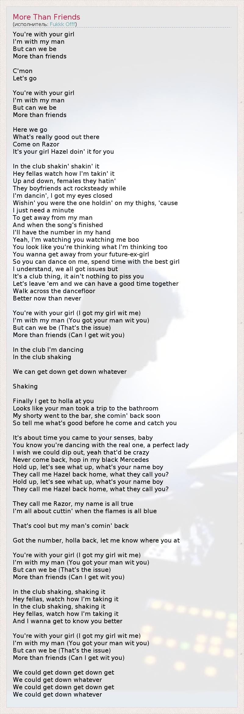 You're with your girl I'm with my man But can we be More than friends C'mon Let's go You're with your girl I'm with my man But can we be More than friends Here we go What's really good out there Come on Razor It's your girl Hazel doin' it for you In the club shakin' shakin' it Hey fellas watch how I'm takin' it Up and down, females they hatin' They boyfriends act rocksteady while I'm dancin', I got my eyes closed Wishin' you were the one holdin' on my thighs, 'cause I just need a minute To get away from my man And when the song's finished I'll have the number in my hand Yeah, I'm watching you watching me boo You look like you're thinking what I'm thinking too You wanna get away from your future-ex-girl So you can dance on me, spend time with the best girl I understand, we all got issues but It's a club thing, it ain't nothing to piss you Let's leave 'em and we can have a good time together Walk across the dancefloor Better now than never You're with your girl (I got my girl wit me) I'm with my man (You got your man wit you) But can we be (That's the issue) More than friends (Can I get wit you) In the club I'm dancing In the club shaking We can get down get down whatever Shaking Finally I get to holla at you Looks like your man took a trip to the bathroom My shorty went to the bar, she comin' back soon So tell me what's good before he come and catch you It's about time you came to your senses, baby You know you're dancing with the real one, a perfect lady I wish we could dip out, yeah that'd be crazy Never come back, hop in my black Mercedes Hold up, let's see what up, what's your name boy They call me Hazel back home, what they call you? Hold up, let's see what up, what's your name boy They call me Hazel back home, what they call you? They call me Razor, my name is all true I'm all about cuttin' when the flames is all blue That's cool but my man's comin' back Got the number, holla back, let me know where you at You're with your girl (I got my girl wit me) I'm with my man (You got your man wit you) But can we be (That's the issue) More than friends (Can I get wit you) In the club shaking, shaking it Hey fellas, watch how I'm taking it In the club shaking, shaking it Hey fellas, watch how I'm taking it And I wanna get to know you better You're with your girl (I got my girl wit me) I'm with my man (You got your man wit you) But can we be (That's the issue) More than friends (Can I get wit you) We could get down get down get We could get down whatever We could get down get down get We could get down whatever