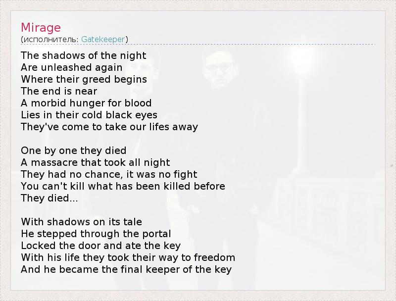 The shadows of the night Are unleashed again Where their greed begins The end is near A morbid hunger for blood Lies in their cold black eyes They've come to take our lifes away One by one they died A massacre that took all night They had no chance, it was no fight You can't kill what has been killed before They died... With shadows on its tale He stepped through the portal Locked the door and ate the key With his life they took their way to freedom And he became the final keeper of the key