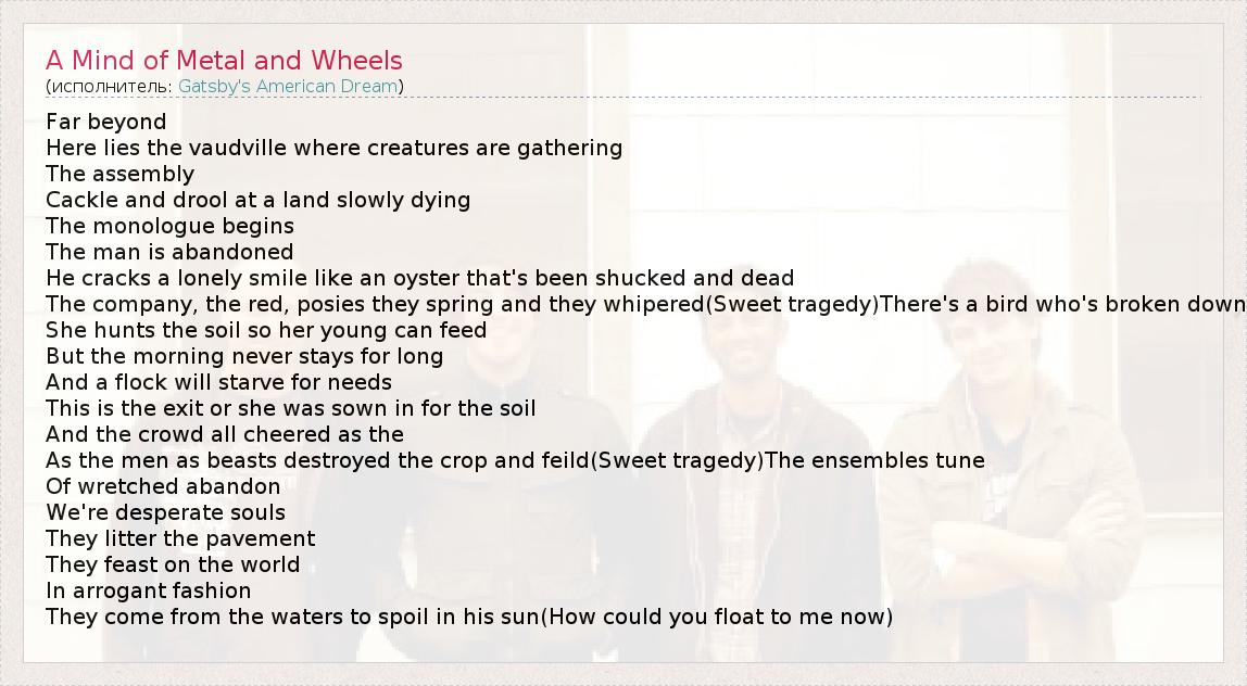 А как ты думаешь, о чем песня "A Mind of Metal and Wheels" ?