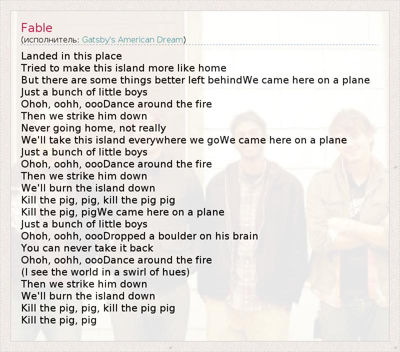 Landed in this place Tried to make this island more like home But there are some things better left behindWe came here on a plane Just a bunch of little boys Ohoh, oohh, oooDance around the fire Then we strike him down Never going home, not really We'll take this island everywhere we goWe came here on a plane Just a bunch of little boys Ohoh, oohh, oooDance around the fire Then we strike him down We'll burn the island down Kill the pig, pig, kill the pig pig Kill the pig, pigWe came here on a plane Just a bunch of little boys Ohoh, oohh, oooDropped a boulder on his brain You can never take it back Ohoh, oohh, oooDance around the fire (I see the world in a swirl of hues) Then we strike him down We'll burn the island down Kill the pig, pig, kill the pig pig Kill the pig, pig