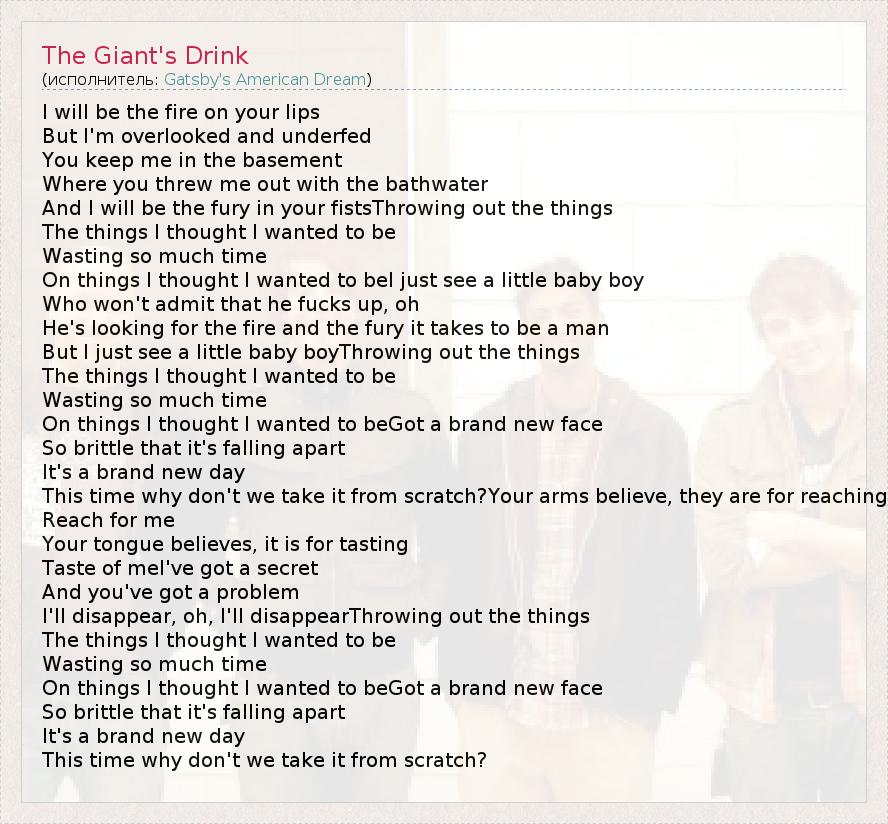Это интересно:Это страница с неправильным вариантом написания названия группы. Правильный вариант - без апострофа перед "s" и выглядит вот так Gatsbys American Dream. Проголосуйте за верный вариант и прежде чем начать скробблинг, внимательно проверьте тэги своих композиций.Gatsbys American Dream (also known as GAD, Gatsby's, or Gatsby) is a prolific Seattle-based indie rock band. Since their founding in 2002, they have released four full-length albums... продолжение