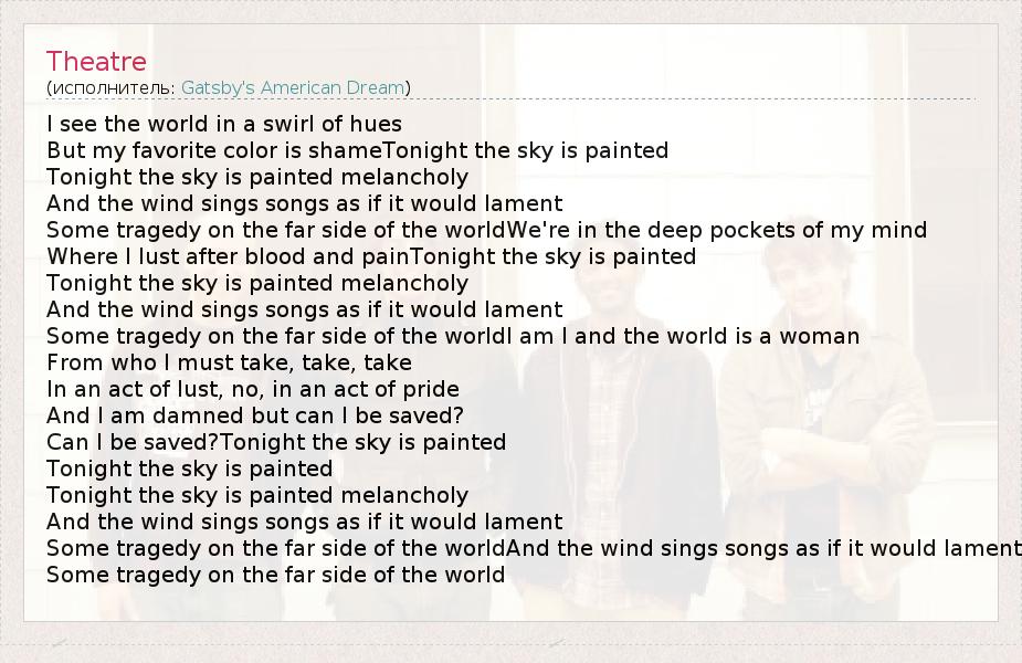 Это интересно:Это страница с неправильным вариантом написания названия группы. Правильный вариант - без апострофа перед "s" и выглядит вот так Gatsbys American Dream. Проголосуйте за верный вариант и прежде чем начать скробблинг, внимательно проверьте тэги своих композиций.Gatsbys American Dream (also known as GAD, Gatsby's, or Gatsby) is a prolific Seattle-based indie rock band. Since their founding in 2002, they have released four full-length albums... продолжение