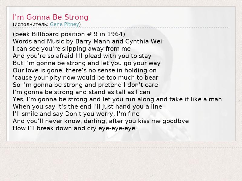 (peak Billboard position # 9 in 1964) Words and Music by Barry Mann and Cynthia Weil I can see you're slipping away from me And you're so afraid I'll plead with you to stay But I'm gonna be strong and let you go your way Our love is gone, there's no sense in holding on 'cause your pity now would be too much to bear So I'm gonna be strong and pretend I don't care I'm gonna be strong and stand as tall as I can Yes, I'm gonna be strong and let you run along and take it like a man When you say it's the end I'll just hand you a line I'll smile and say Don't you worry, I'm fine And you'll never know, darling, after you kiss me goodbye How I'll break down and cry eye-eye-eye.