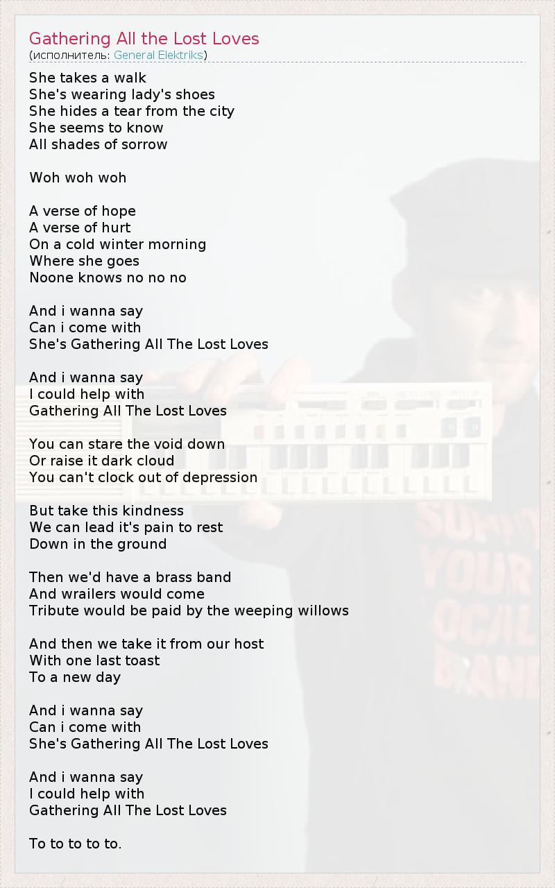 She takes a walk She's wearing lady's shoes She hides a tear from the city She seems to know All shades of sorrow Woh woh woh A verse of hope A verse of hurt On a cold winter morning Where she goes Noone knows no no no And i wanna say Can i come with She's Gathering All The Lost Loves And i wanna say I could help with Gathering All The Lost Loves You can stare the void down Or raise it dark cloud You can't clock out of depression But take this kindness We can lead it's pain to rest Down in the ground Then we'd have a brass band And wrailers would come Tribute would be paid by the weeping willows And then we take it from our host With one last toast To a new day And i wanna say Can i come with She's Gathering All The Lost Loves And i wanna say I could help with Gathering All The Lost Loves To to to to to.