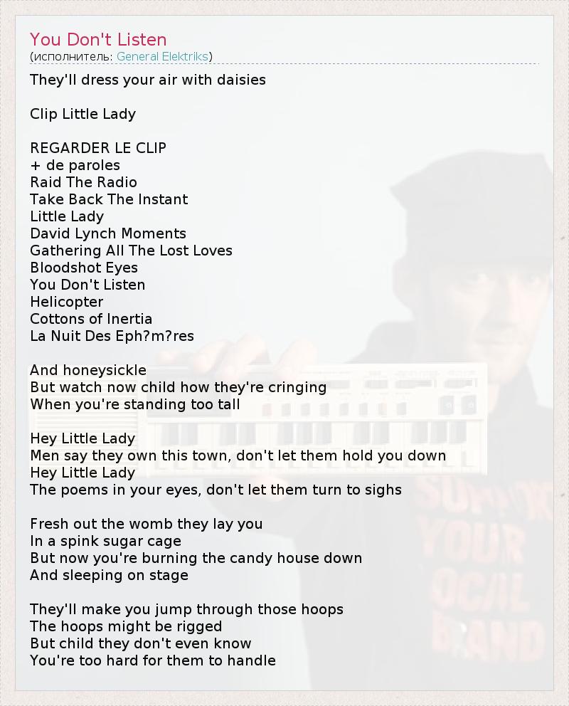 They'll dress your air with daisies Clip Little Lady REGARDER LE CLIP + de paroles Raid The Radio Take Back The Instant Little Lady David Lynch Moments Gathering All The Lost Loves Bloodshot Eyes You Don't Listen Helicopter Cottons of Inertia La Nuit Des Eph?m?res And honeysickle But watch now child how they're cringing When you're standing too tall Hey Little Lady Men say they own this town, don't let them hold you down Hey Little Lady The poems in your eyes, don't let them turn to sighs Fresh out the womb they lay you In a spink sugar cage But now you're burning the candy house down And sleeping on stage They'll make you jump through those hoops The hoops might be rigged But child they don't even know You're too hard for them to handle