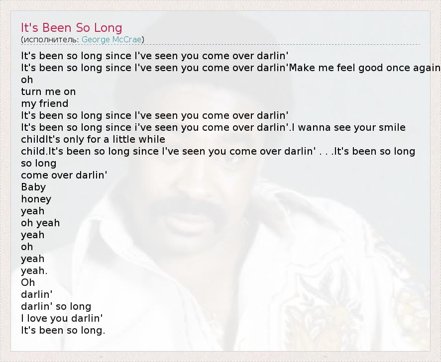 It's been so long since I've seen you come over darlin' It's been so long since I've seen you come over darlin'Make me feel good once again oh turn me on my friend It's been so long since I've seen you come over darlin' It's been so long since i've seen you come over darlin'.I wanna see your smile childIt's only for a little while child.It's been so long since I've seen you come over darlin' . . .It's been so long so long come over darlin' Baby honey yeah oh yeah yeah oh yeah yeah. Oh darlin' darlin' so long I love you darlin' It's been so long.