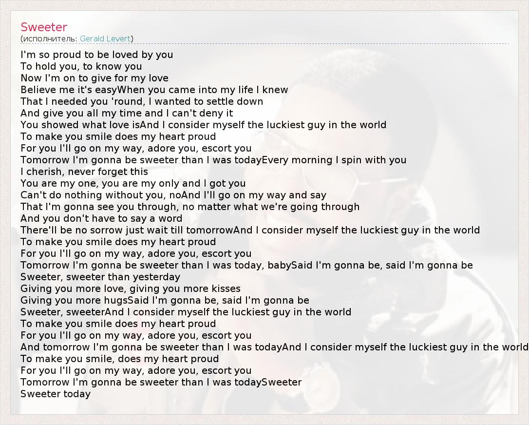 I'm so proud to be loved by you To hold you, to know you Now I'm on to give for my love Believe me it's easyWhen you came into my life I knew That I needed you 'round, I wanted to settle down And give you all my time and I can't deny it You showed what love isAnd I consider myself the luckiest guy in the world To make you smile does my heart proud For you I'll go on my way, adore you, escort you Tomorrow I'm gonna be sweeter than I was todayEvery morning I spin with you I cherish, never forget this You are my one, you are my only and I got you Can't do nothing without you, noAnd I'll go on my way and say That I'm gonna see you through, no matter what we're going through And you don't have to say a word There'll be no sorrow just wait till tomorrowAnd I consider myself the luckiest guy in the world To make you smile does my heart proud For you I'll go on my way, adore you, escort you Tomorrow I'm gonna be sweeter than I was today, babySaid I'm gonna be, said I'm gonna be Sweeter, sweeter than yesterday Giving you more love, giving you more kisses Giving you more hugsSaid I'm gonna be, said I'm gonna be Sweeter, sweeterAnd I consider myself the luckiest guy in the world To make you smile does my heart proud For you I'll go on my way, adore you, escort you And tomorrow I'm gonna be sweeter than I was todayAnd I consider myself the luckiest guy in the world To make you smile, does my heart proud For you I'll go on my way, adore you, escort you Tomorrow I'm gonna be sweeter than I was todaySweeter Sweeter today