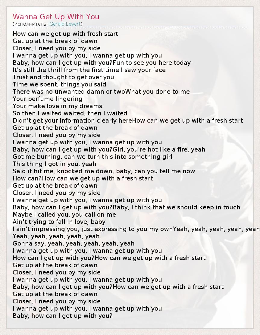 How can we get up with fresh start Get up at the break of dawn Closer, I need you by my side I wanna get up with you, I wanna get up with you Baby, how can I get up with you?Fun to see you here today It's still the thrill from the first time I saw your face Trust and thought to get over you Time we spent, things you said There was no unwanted damn or twoWhat you done to me Your perfume lingering Your make love in my dreams So then I waited waited, then I waited Didn't get your information clearly hereHow can we get up with a fresh start Get up at the break of dawn Closer, I need you by my side I wanna get up with you, I wanna get up with you Baby, how can I get up with you?Girl, you're hot like a fire, yeah Got me burning, can we turn this into something girl This thing I got in you, yeah Said it hit me, knocked me down, baby, can you tell me now How can?How can we get up with a fresh start Get up at the break of dawn Closer, I need you by my side I wanna get up with you, I wanna get up with you Baby, how can I get up with you?Baby, I think that we should keep in touch Maybe I called you, you call on me Ain't trying to fall in love, baby I ain't impressing you, just expressing to you my ownYeah, yeah, yeah, yeah, yeah Yeah, yeah, yeah, yeah, yeah Gonna say, yeah, yeah, yeah, yeah, yeah I wanna get up with you, I wanna get up with you How can I get up with you?How can we get up with a fresh start Get up at the break of dawn Closer, I need you by my side I wanna get up with you, I wanna get up with you Baby, how can I get up with you?How can we get up with a fresh start Get up at the break of dawn Closer, I need you by my side I wanna get up with you, I wanna get up with you Baby, how can I get up with you?