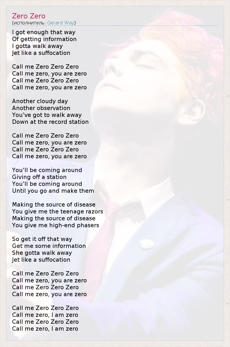 I got enough that way Of getting information I gotta walk away Jet like a suffocation Call me Zero Zero Zero Call me zero, you are zero Call me Zero Zero Zero Call me zero, you are zero Another cloudy day Another observation You've got to walk away Down at the record station Call me Zero Zero Zero Call me zero, you are zero Call me Zero Zero Zero Call me zero, you are zero You'll be coming around Giving off a station You'll be coming around Until you go and make them Making the source of disease You give me the teenage razors Making the source of disease You give me high-end phasers So get it off that way Get me some information She gotta walk away Jet like a suffocation Call me Zero Zero Zero Call me zero, you are zero Call me Zero Zero Zero Call me zero, you are zero Call me Zero Zero Zero Call me zero, I am zero Call me Zero Zero Zero Call me zero, I am zero