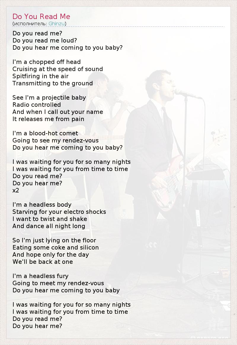 Do you read me? Do you read me loud? Do you hear me coming to you baby? I'm a chopped off head Cruising at the speed of sound Spitfiring in the air Transmitting to the ground See I'm a projectile baby Radio controlled And when I call out your name It releases me from pain I'm a blood-hot comet Going to see my rendez-vous Do you hear me coming to you baby? I was waiting for you for so many nights I was waiting for you from time to time Do you read me? Do you hear me? x2 I'm a headless body Starving for your electro shocks I want to twist and shake And dance all night long So I'm just lying on the floor Eating some coke and silicon And hope only for the day We'll be back at one I'm a headless fury Going to meet my rendez-vous Do you hear me coming to you baby I was waiting for you for so many nights I was waiting for you from time to time Do you read me? Do you hear me?