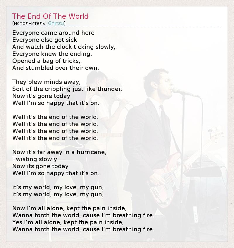 Everyone came around here Everyone else got sick And watch the clock ticking slowly, Everyone knew the ending, Opened a bag of tricks, And stumbled over their own, They blew minds away, Sort of the crippling just like thunder. Now it's gone today Well I'm so happy that it's on. Well it's the end of the world. Well it's the end of the world. Well it's the end of the world. Well it's the end of the world. Now it's far away in a hurricane, Twisting slowly Now its gone today Well I'm so happy that it's on. it's my world, my love, my gun, it's my world, my love, my gun, Now I'm all alone, kept the pain inside, Wanna torch the world, cause I'm breathing fire. Yes I'm all alone, kept the pain inside, Wanna torch the world, cause I'm breathing fire.