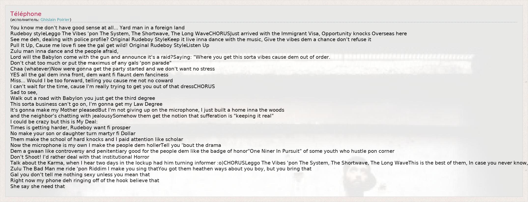 Rudeboy styleLeggo The Vibes 'pon The System, The Shortwave, The Long WaveCHORUSJust arrived with the Immigrant Visa, Opportunity knocks Overseas here