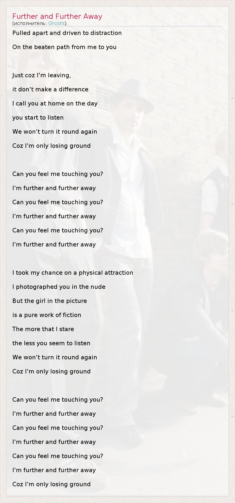 Pulled apart and driven to distraction On the beaten path from me to you Just coz I'm leaving, it don't make a difference I call you at home on the day you start to listen We won't turn it round again Coz I'm only losing ground Can you feel me touching you? I'm further and further away Can you feel me touching you? I'm further and further away Can you feel me touching you? I'm further and further away I took my chance on a physical attraction I photographed you in the nude But the girl in the picture is a pure work of fiction The more that I stare the less you seem to listen We won't turn it round again Coz I'm only losing ground Can you feel me touching you? I'm further and further away Can you feel me touching you? I'm further and further away Can you feel me touching you? I'm further and further away Coz I'm only losing ground