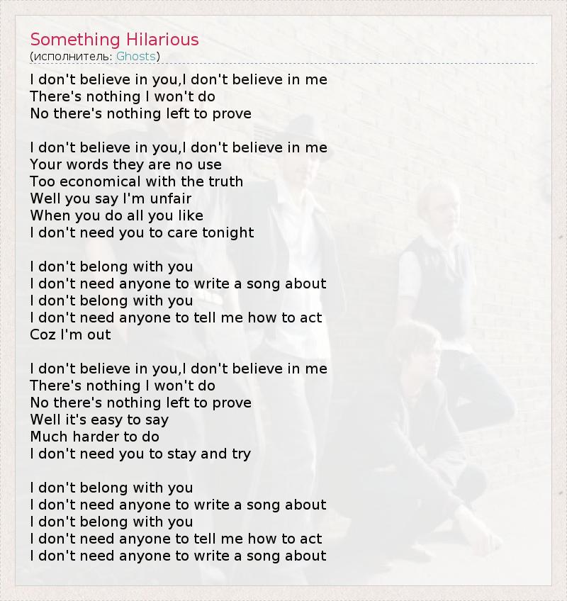 I don't believe in you,I don't believe in me There's nothing I won't do No there's nothing left to prove I don't believe in you,I don't believe in me Your words they are no use Too economical with the truth Well you say I'm unfair When you do all you like I don't need you to care tonight I don't belong with you I don't need anyone to write a song about I don't belong with you I don't need anyone to tell me how to act Coz I'm out I don't believe in you,I don't believe in me There's nothing I won't do No there's nothing left to prove Well it's easy to say Much harder to do I don't need you to stay and try I don't belong with you I don't need anyone to write a song about I don't belong with you I don't need anyone to tell me how to act I don't need anyone to write a song about