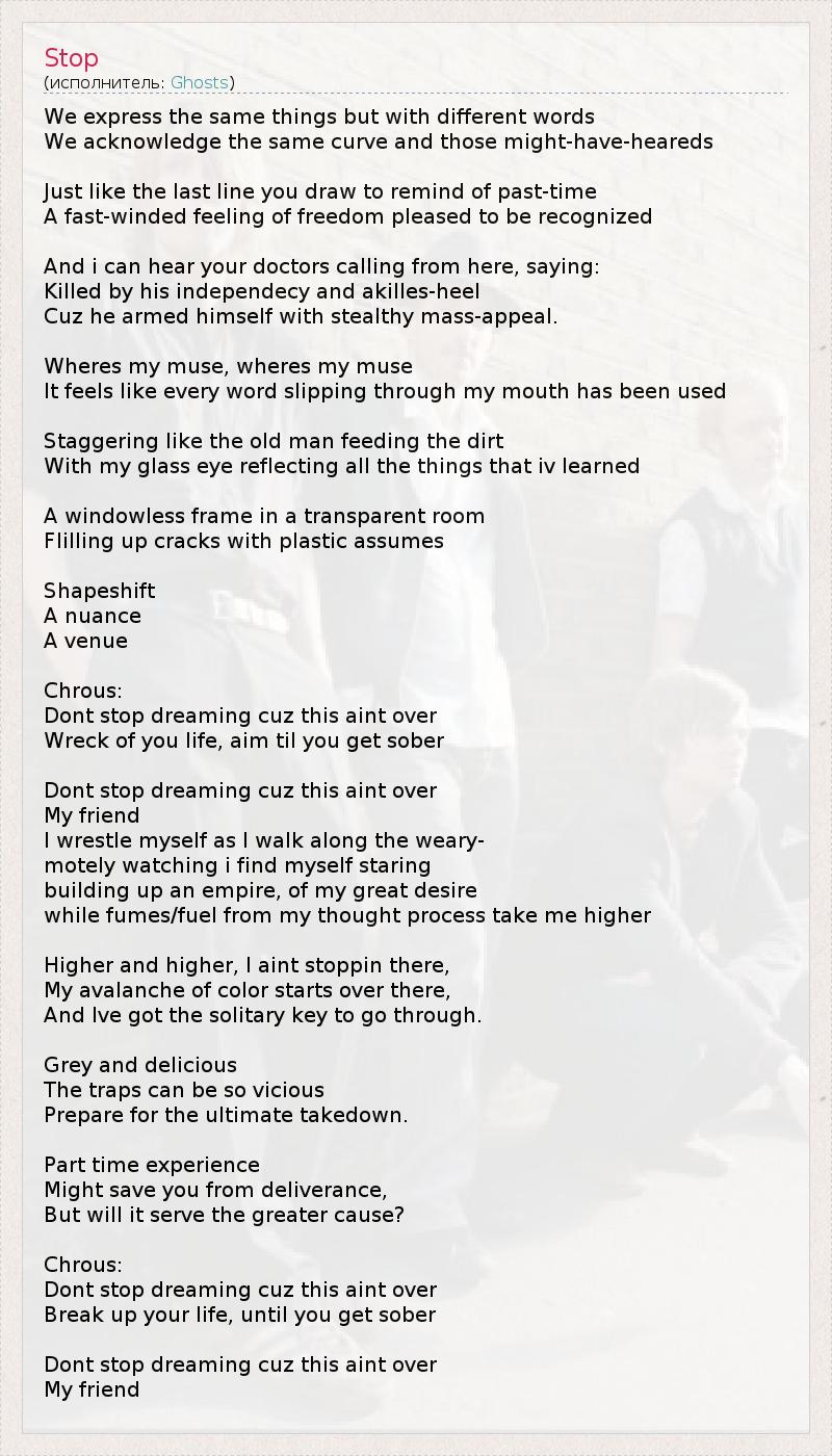 We express the same things but with different words We acknowledge the same curve and those might-have-heareds Just like the last line you draw to remind of past-time A fast-winded feeling of freedom pleased to be recognized And i can hear your doctors calling from here, saying: Killed by his independecy and akilles-heel Cuz he armed himself with stealthy mass-appeal. Wheres my muse, wheres my muse It feels like every word slipping through my mouth has been used Staggering like the old man feeding the dirt With my glass eye reflecting all the things that iv learned A windowless frame in a transparent room Flilling up cracks with plastic assumes Shapeshift A nuance A venue Chrous: Dont stop dreaming cuz this aint over Wreck of you life, aim til you get sober Dont stop dreaming cuz this aint over My friend I wrestle myself as I walk along the weary- motely watching i find myself staring building up an empire, of my great desire while fumes/fuel from my thought process take me higher Higher and higher, I aint stoppin there, My avalanche of color starts over there, And Ive got the solitary key to go through. Grey and delicious The traps can be so vicious Prepare for the ultimate takedown. Part time experience Might save you from deliverance, But will it serve the greater cause? Chrous: Dont stop dreaming cuz this aint over Break up your life, until you get sober Dont stop dreaming cuz this aint over My friend