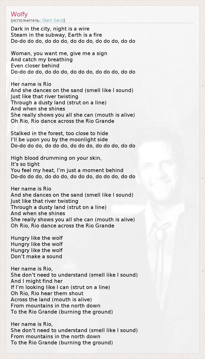 Dark in the city, night is a wire Steam in the subway, Earth is a fire Do-do do do, do do do, do do do, do do do, do do Woman, you want me, give me a sign And catch my breathing Even closer behind Do-do do do, do do do, do do do, do do do, do do Her name is Rio And she dances on the sand (smell like I sound) Just like that river twisting Through a dusty land (strut on a line) And when she shines She really shows you all she can (mouth is alive) Oh Rio, Rio dance across the Rio Grande Stalked in the forest, too close to hide I'll be upon you by the moonlight side Do-do do do, do do do, do do do, do do do, do do High blood drumming on your skin, It's so tight You feel my heat, I'm just a moment behind Do-do do do, do do do, do do do, do do do, do do Her name is Rio And she dances on the sand (smell like I sound) Just like that river twisting Through a dusty land (strut on a line) And when she shines She really shows you all she can (mouth is alive) Oh Rio, Rio dance across the Rio Grande Hungry like the wolf Hungry like the wolf Hungry like the wolf Don't make a sound Her name is Rio, She don't need to understand (smell like I sound) And I might find her If I'm looking like I can (strut on a line) Oh Rio, Rio hear them shout Across the land (mouth is alive) From mountains in the north down To the Rio Grande (burning the ground) Her name is Rio, She don't need to understand (smell like I sound) From mountains in the north down To the Rio Grande (burning the ground)