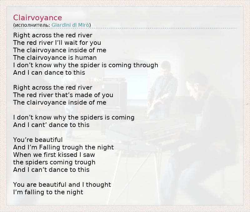 Right across the red river The red river I’ll wait for you The clairvoyance inside of me The clairvoyance is human I don’t know why the spider is coming through And I can dance to this Right across the red river The red river that’s made of you The clairvoyance inside of me I don’t know why the spiders is coming And I cant’ dance to this You’re beautiful And I’m Falling trough the night When we first kissed I saw the spiders coming trough And I can’t dance to this You are beautiful and I thought I’m falling to the night
